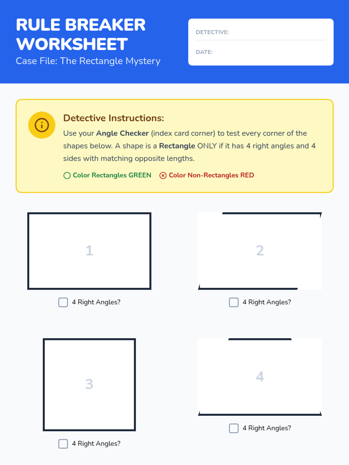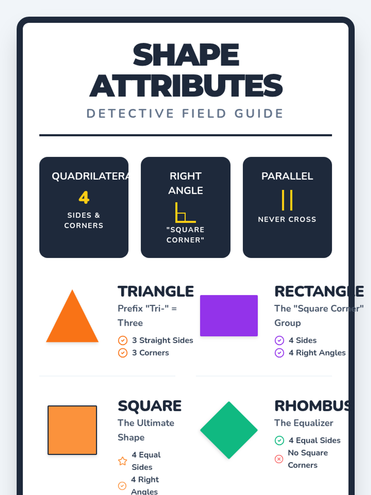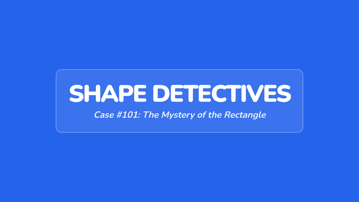 Engaging slide deck for the Shape Detective Agency lesson, featuring the Khan Academy geometry video, visual pause points for teacher-led discussion, and high-impact graphics for right angles and quadrilaterals.
