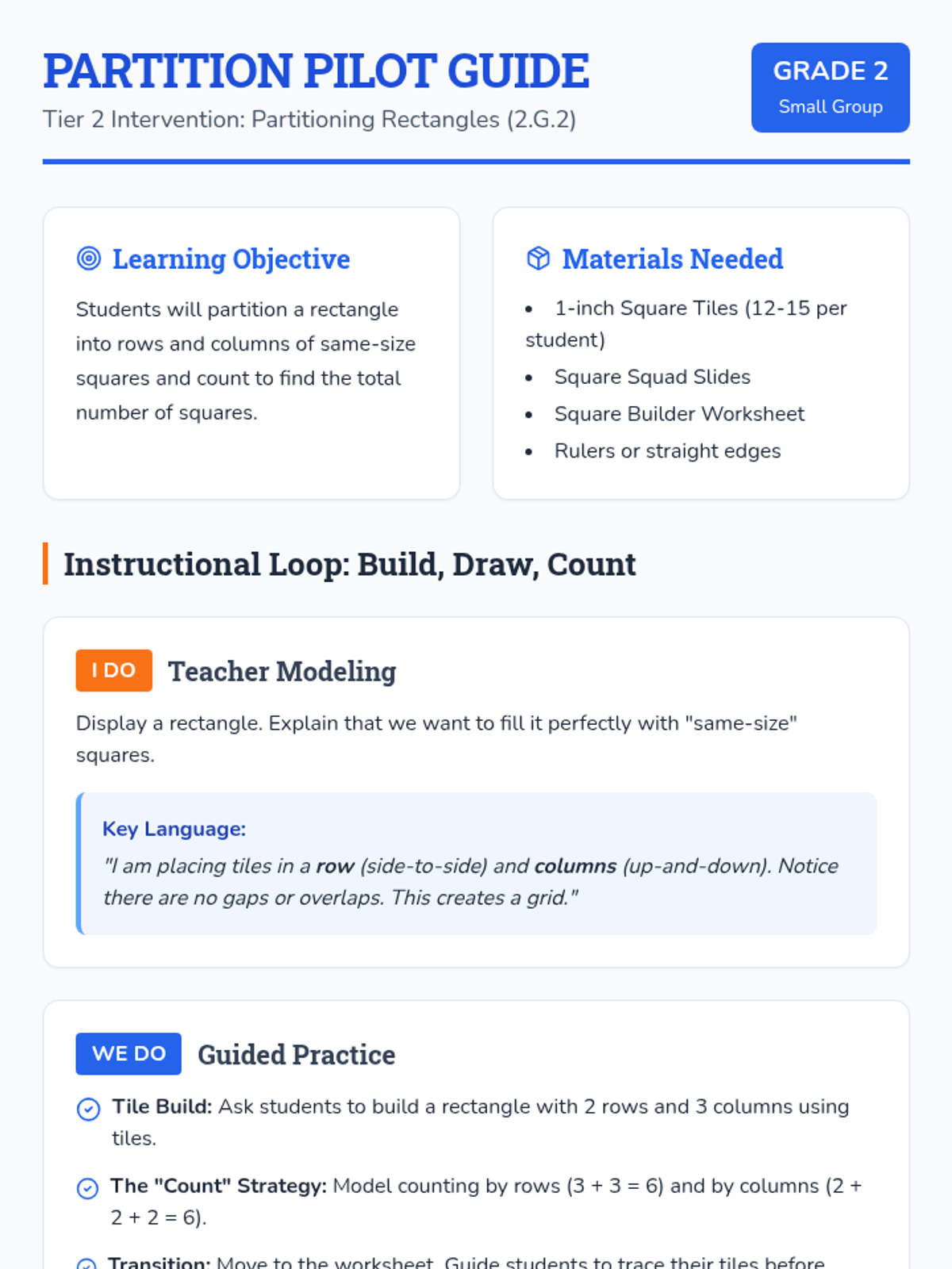 A comprehensive teacher facilitation guide for a Tier 2 intervention on partitioning rectangles. Includes learning objectives, materials, a structured I Do/We Do/You Do sequence, and specific scaffolding strategies for Grade 2 students.