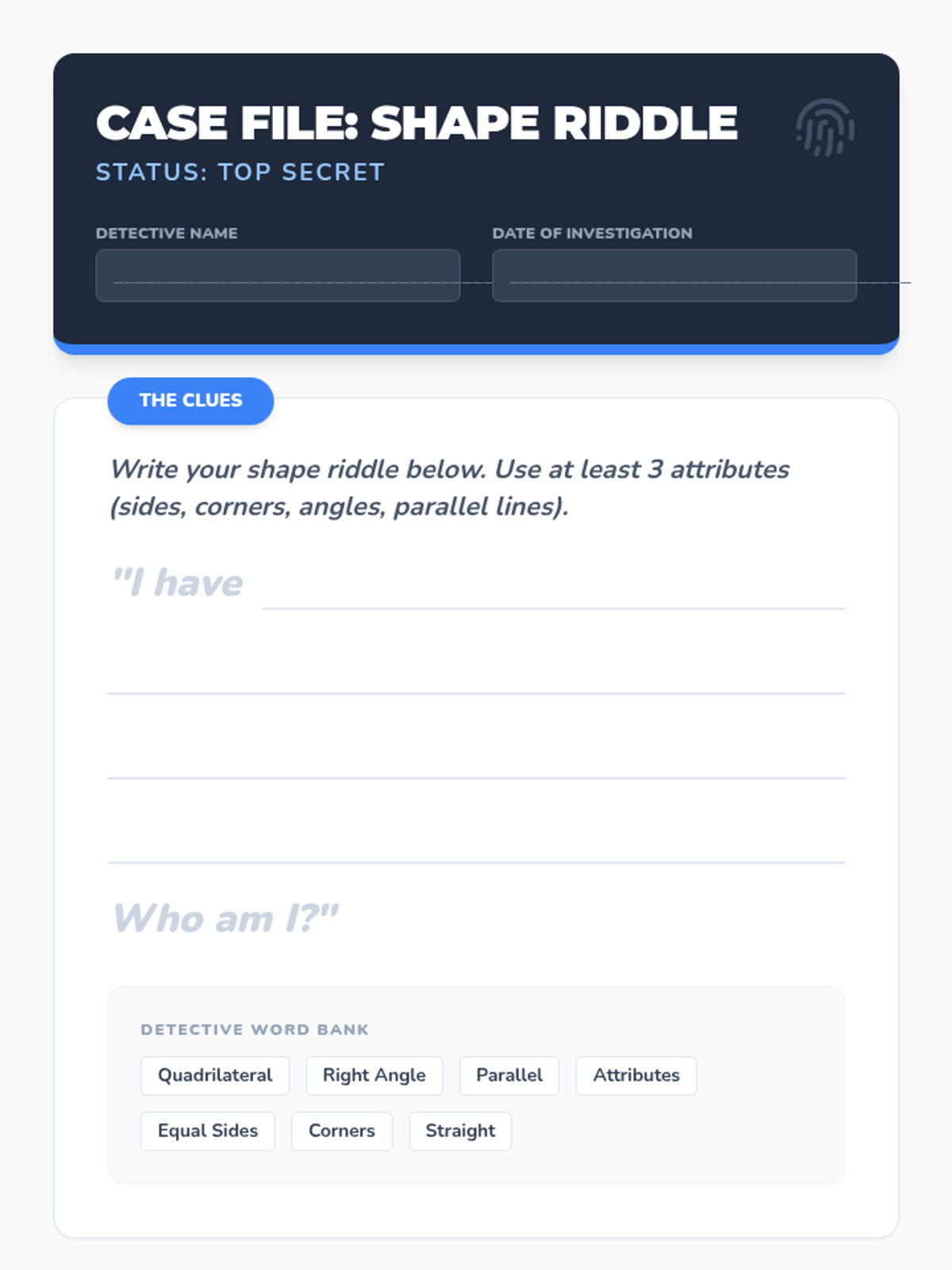 A riddle writing template where students use precise geometric vocabulary to create their own shape mysteries.