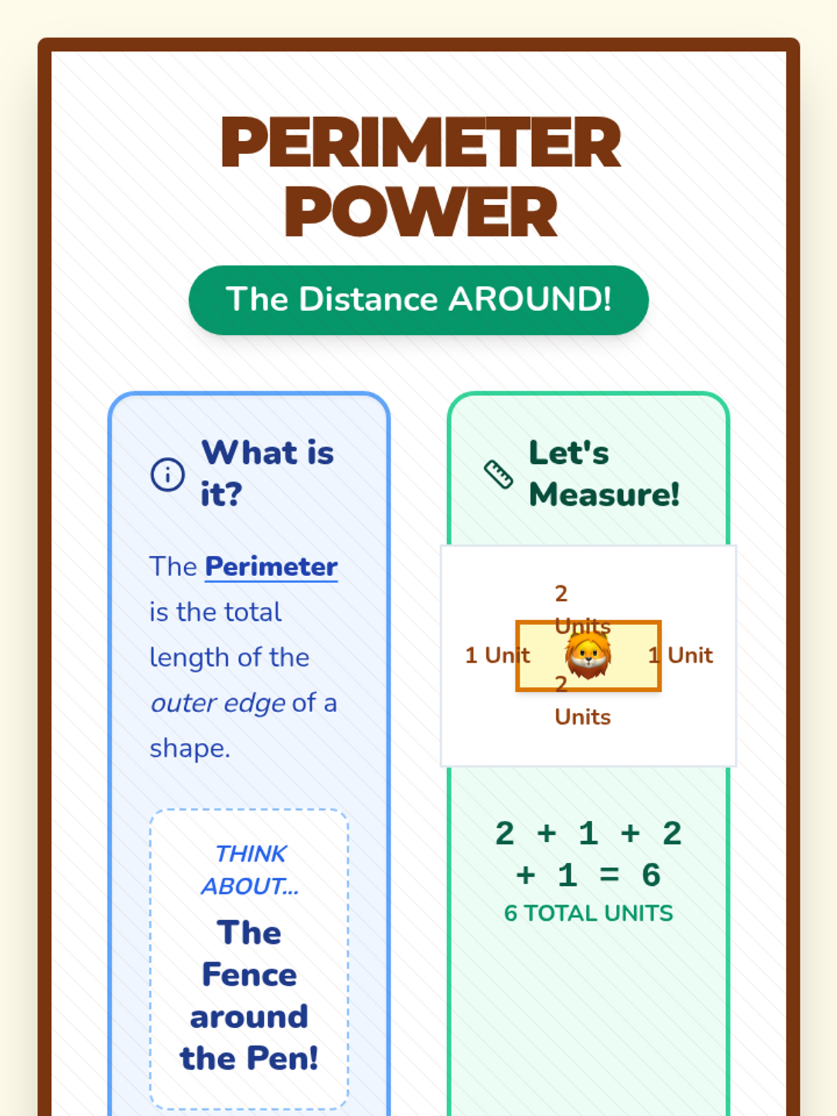 A bright, visual anchor chart for 2nd graders that defines perimeter as the distance around a shape, featuring a zoo-themed example and step-by-step instructions.