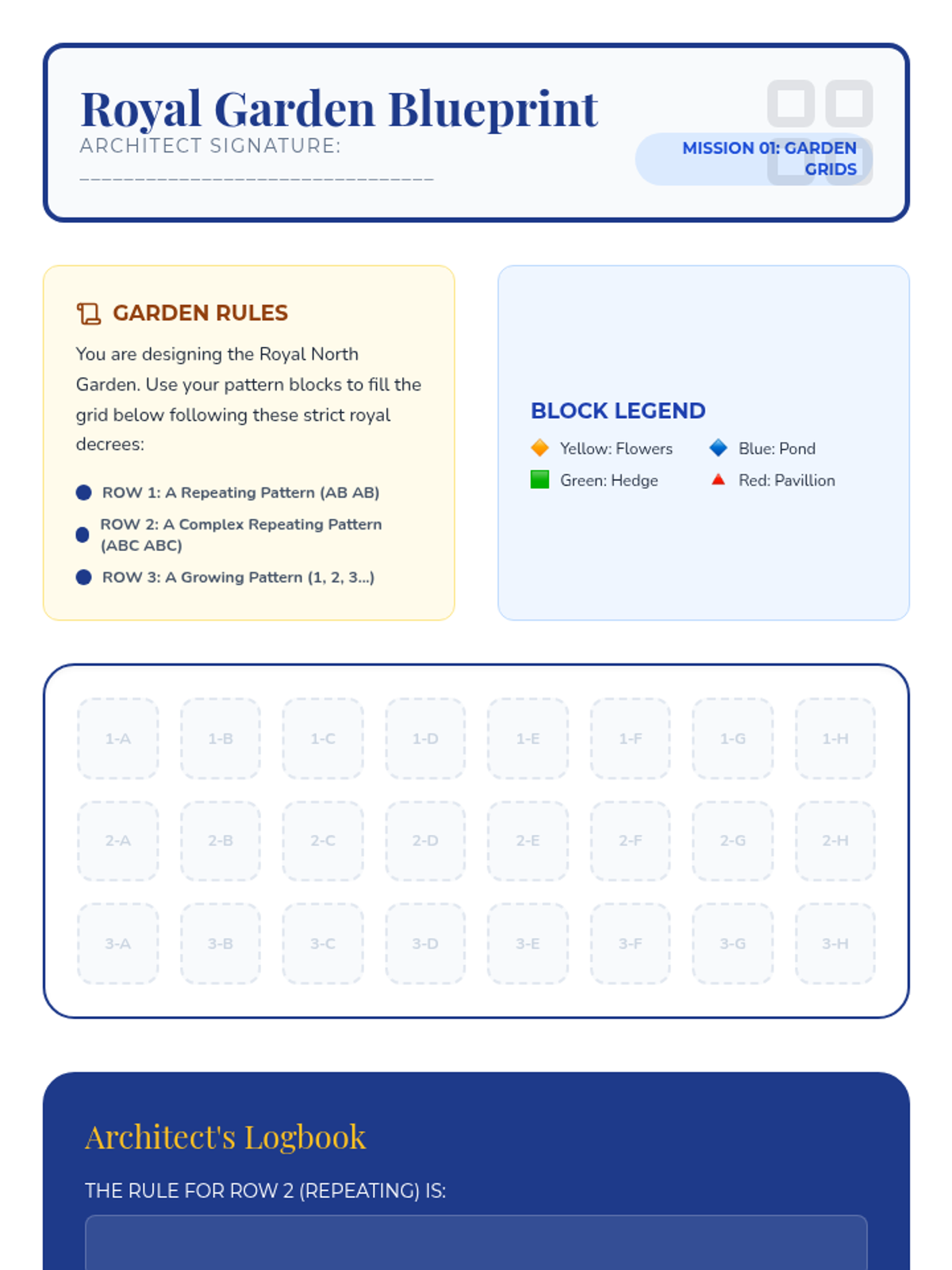 A hands-on activity mat where students use pattern blocks to design garden rows following specific repeating and growing rules.