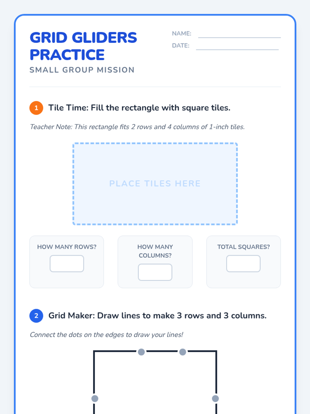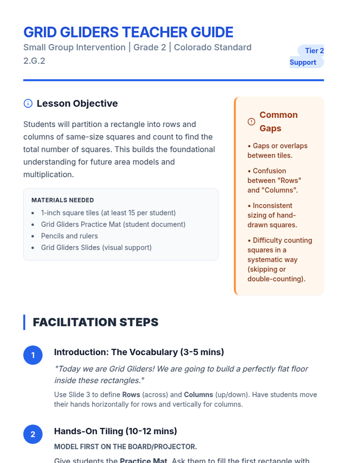 A comprehensive teacher facilitation guide for the Grid Gliders lesson. Includes specific instructional steps, common student misconceptions to watch for, and differentiation strategies for Tier 2 intervention.