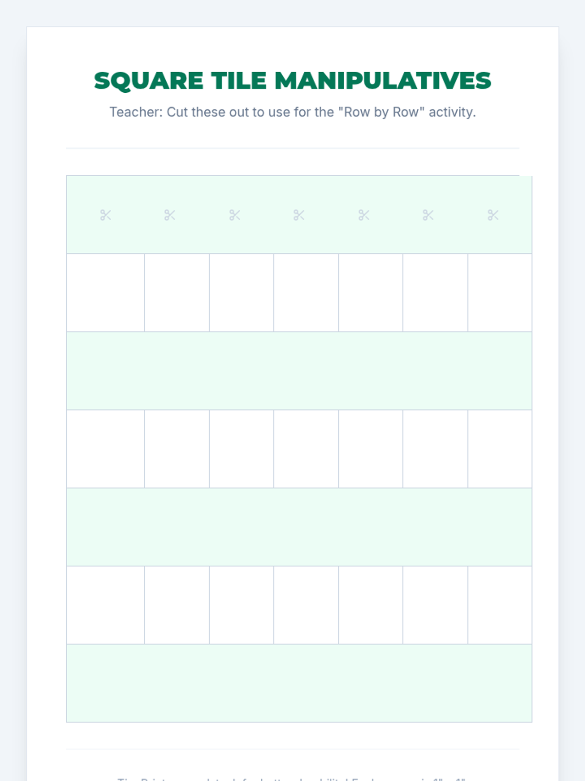 A printable sheet of square unit tiles that can be cut out and used as physical manipulatives for building rectangles and exploring area concepts.