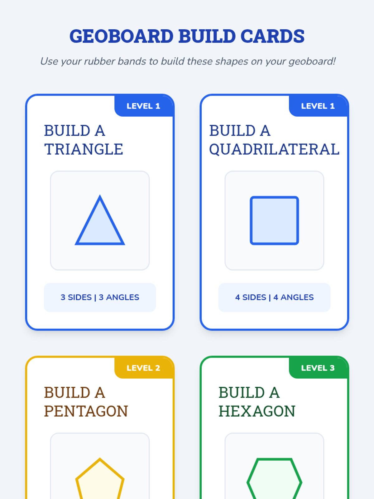 Scaffolded task cards for geoboard activities. Each card features a shape (triangle, quadrilateral, pentagon, hexagon), its required attributes, and a visual model. Includes a bonus challenge for higher-order thinking.