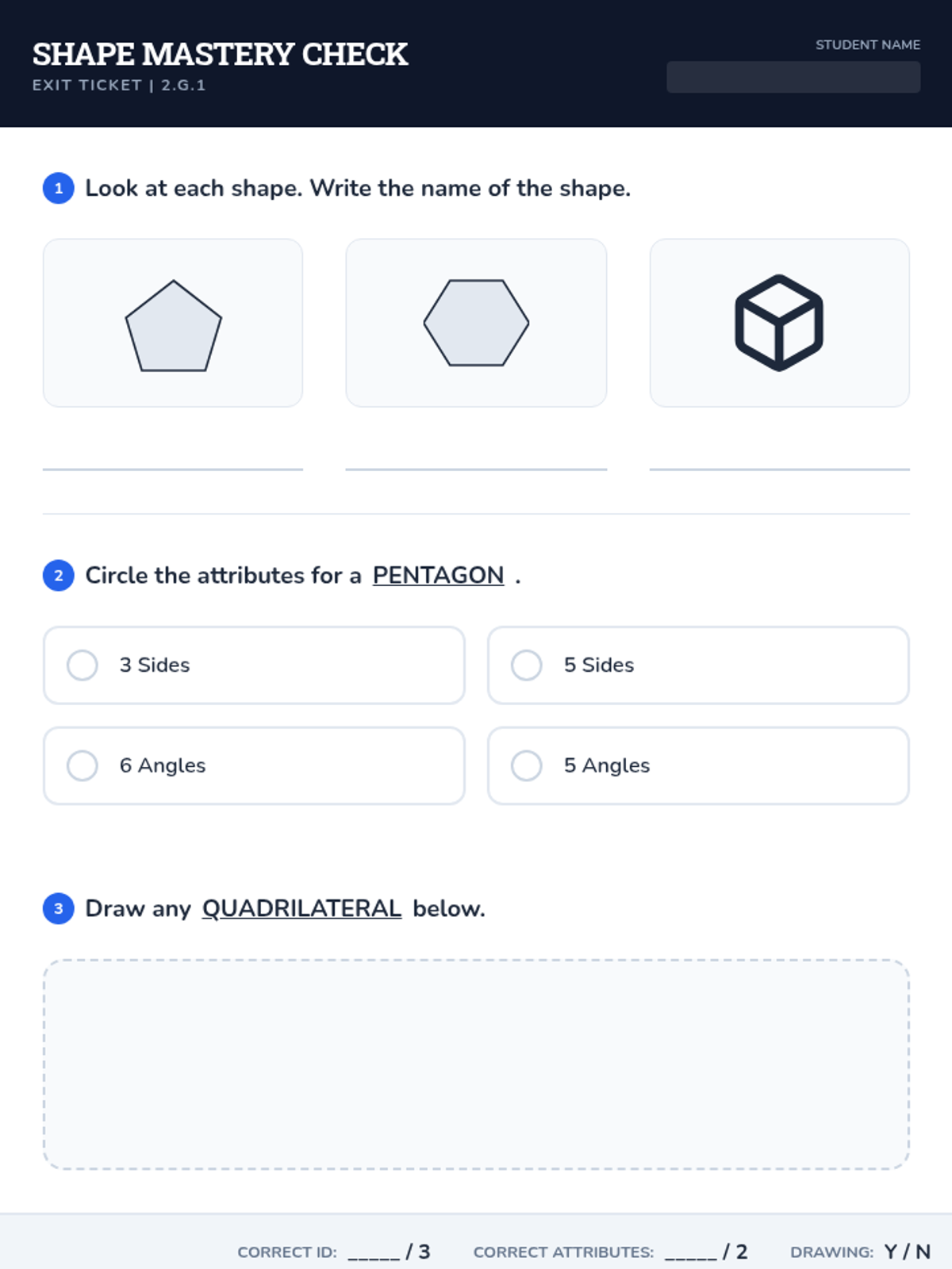 A formative assessment (exit ticket) for students to demonstrate their ability to identify 2D shapes by sides/angles, count attributes on a hexagon, identify a cube by its faces, and draw a pentagon.
