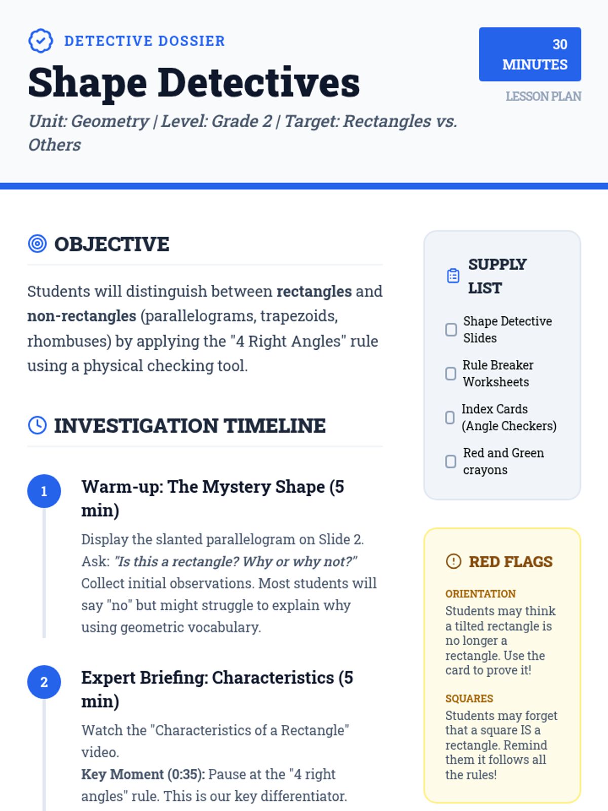 A comprehensive teacher guide for the Shape Detectives lesson, including pacing, discussion prompts, material checklists, and common misconceptions for 2nd-grade geometry.