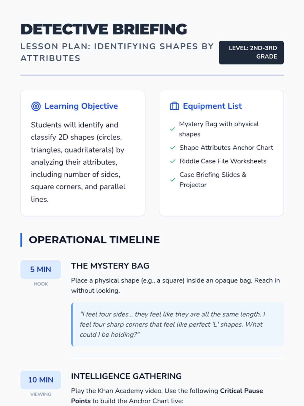 A comprehensive teacher guide for the Shape Detective Agency lesson, including a timed lesson flow, specific video pause points, mystery bag prompts, and tips for addressing common geometric misconceptions.