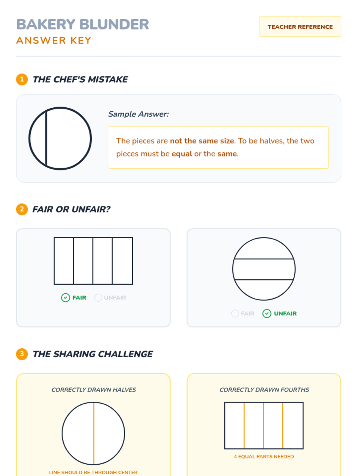 Answer key for the Bakery Shares worksheet, providing sample responses for error analysis and correct partitioning examples.