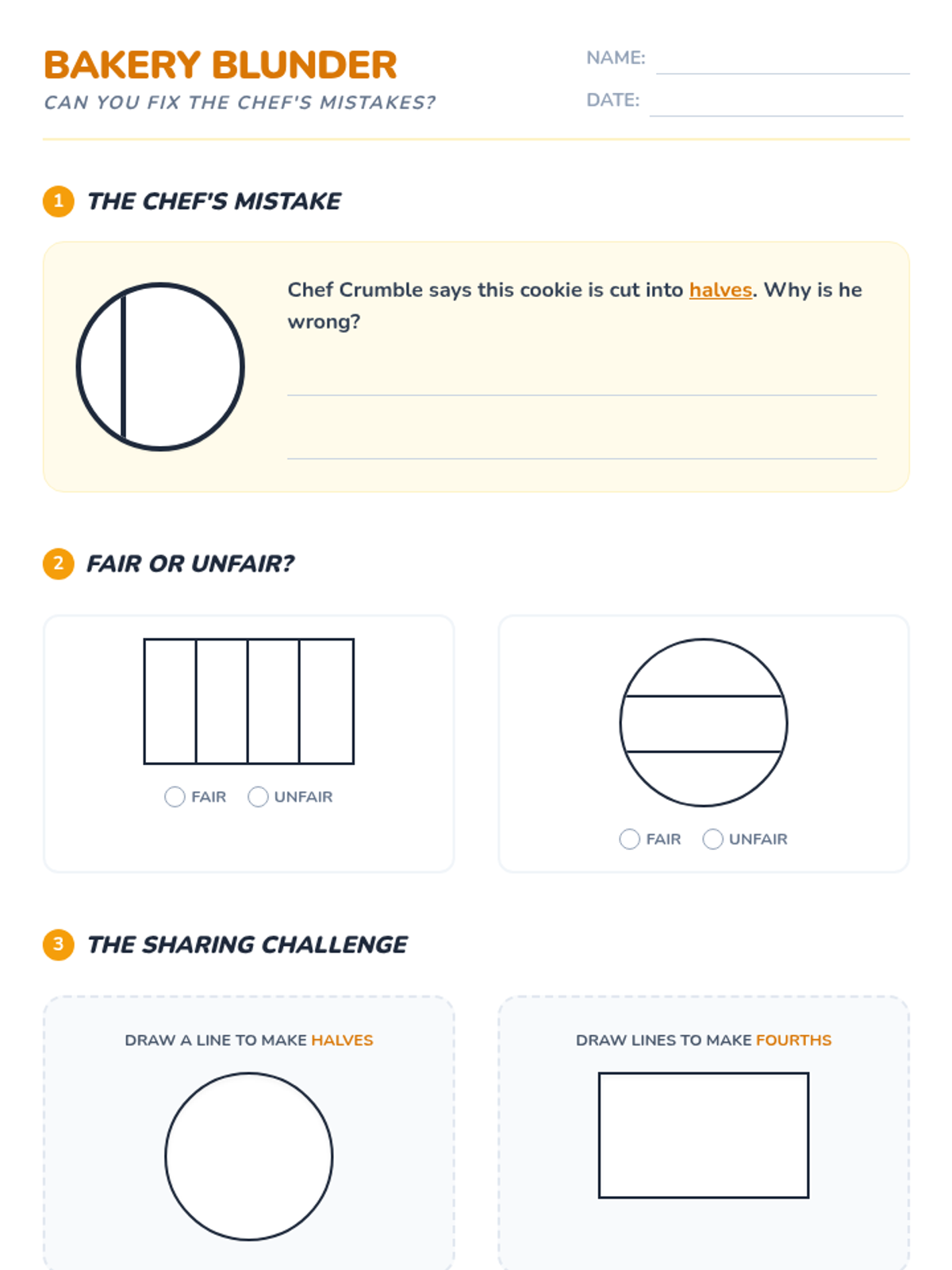 A student worksheet for identifying fair shares, explaining errors in partitioning, and drawing halves and fourths on circles and rectangles.