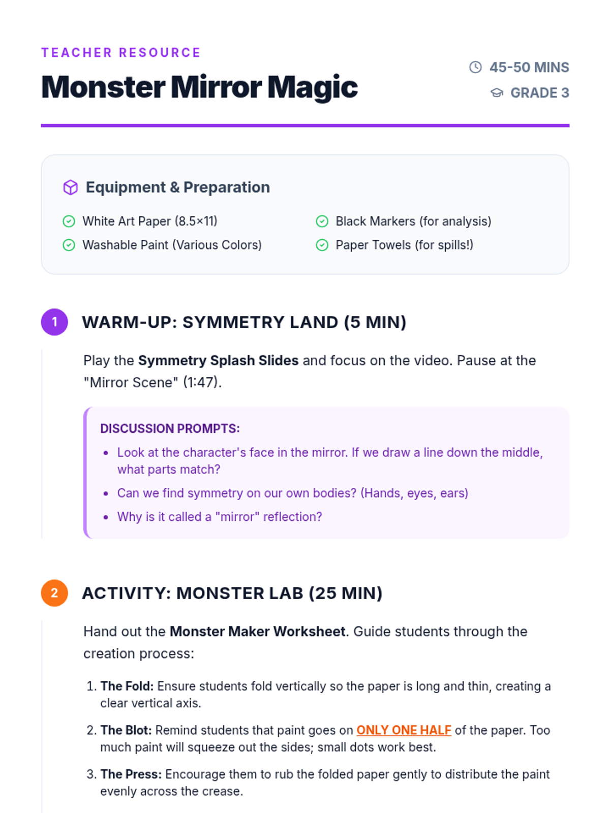 Visual presentation slides to guide students through the symmetry land video, key concepts of reflection, and the step-by-step monster-making activity.