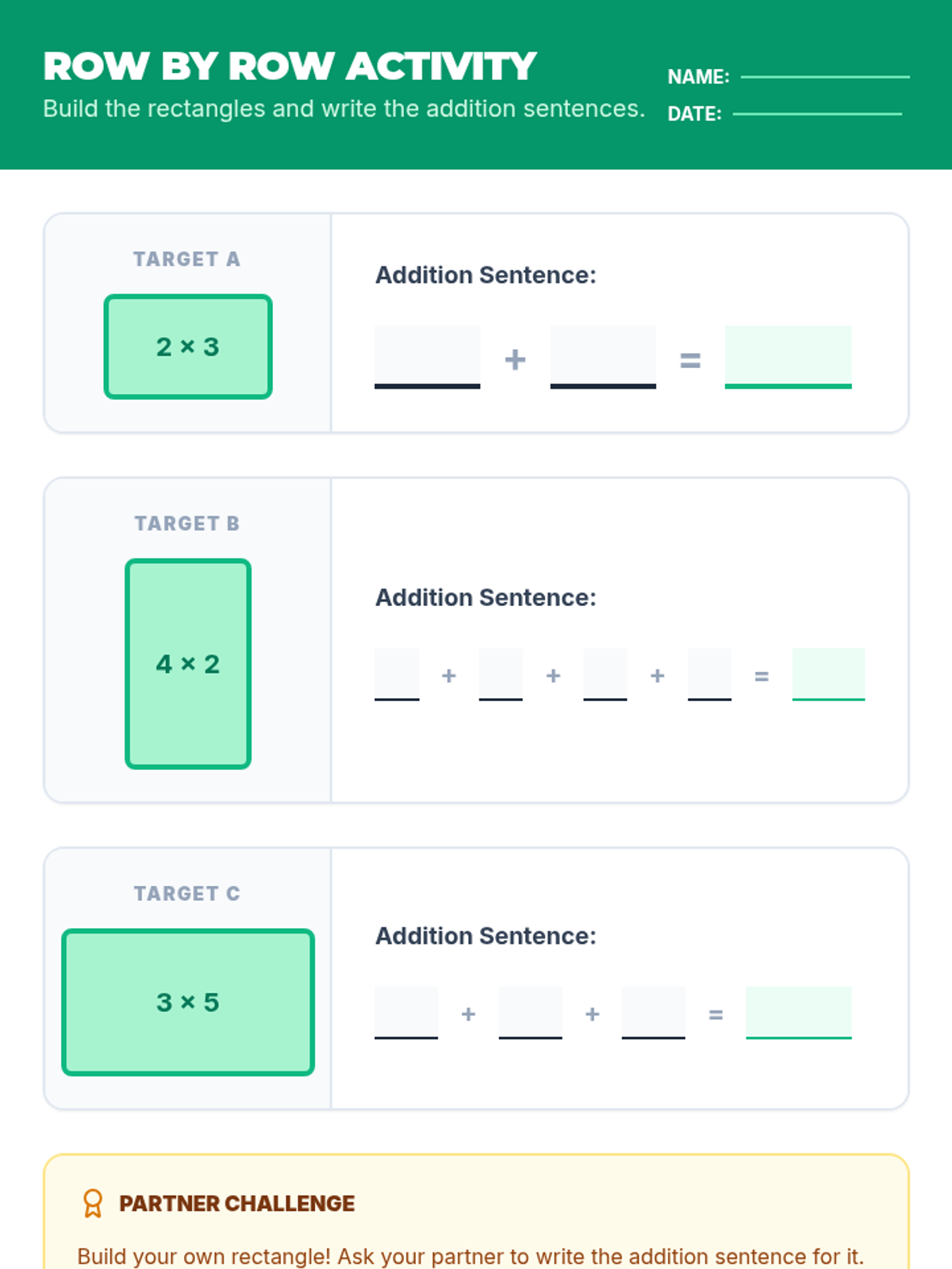 A student recording sheet for the 'Row by Row' activity, providing structured space for students to build three specific rectangles and write the corresponding repeated addition sentences.