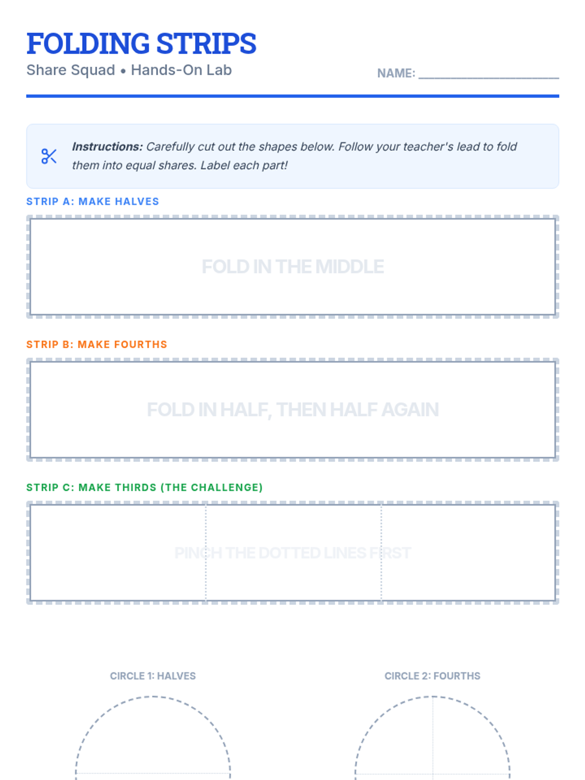 A set of printable rectangular strips and circles for hands-on folding activities. Includes scaffolded dotted lines for thirds and fourths to support Tier 2 learners.