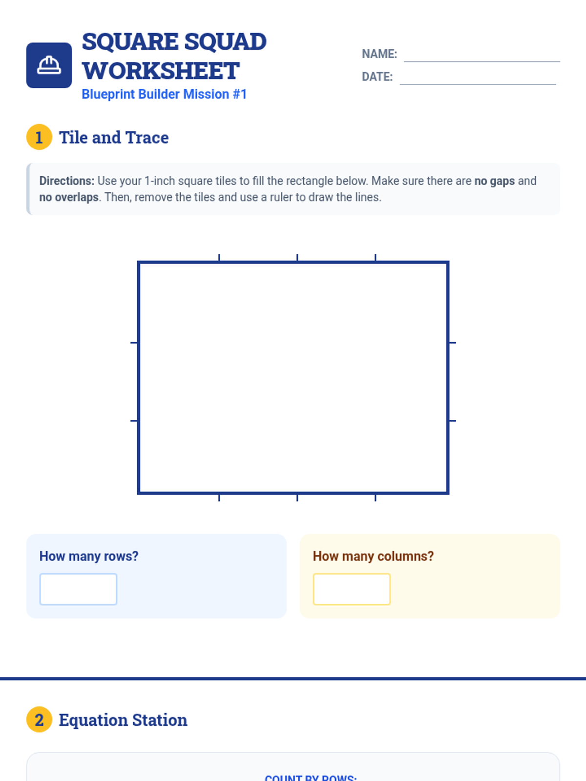 A visual slide deck designed for Grade 2 small group intervention. It introduces the concepts of rows and columns, demonstrates how to tile a rectangle, and shows the transition from physical tiles to a drawn grid.