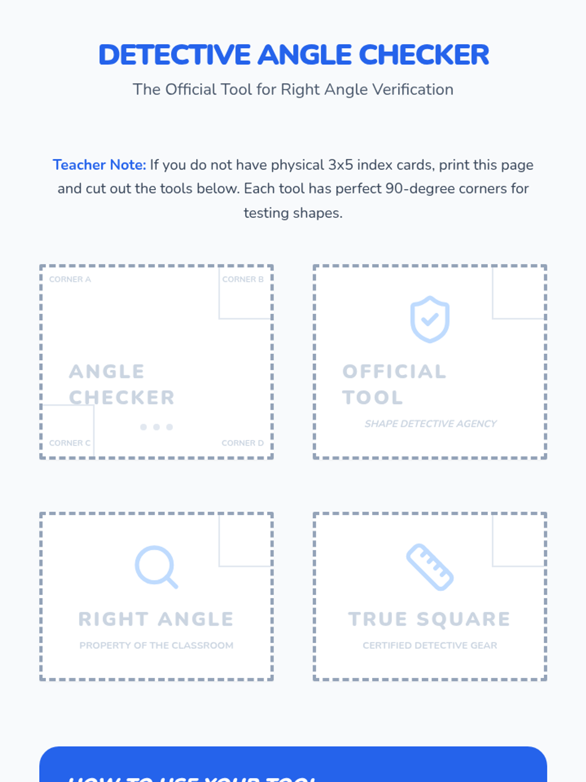 A printable page of 'Angle Checker' tools, designed to be cut out and used as index-card substitutes. These tools help students physically verify right angles in the 'Shape Detectives' lesson.
