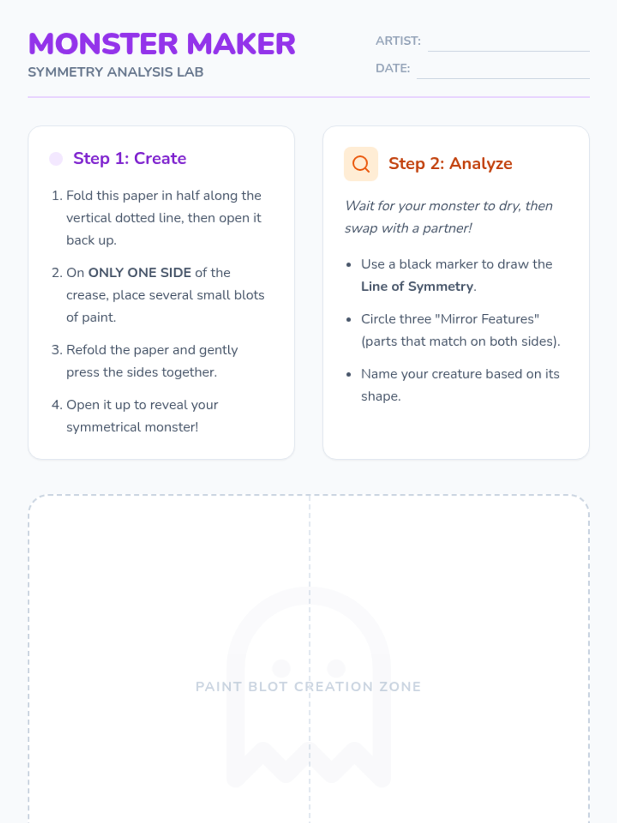A structured art activity and analysis worksheet where students create a paint-blot symmetrical monster, identify its line of symmetry, and document matching features.