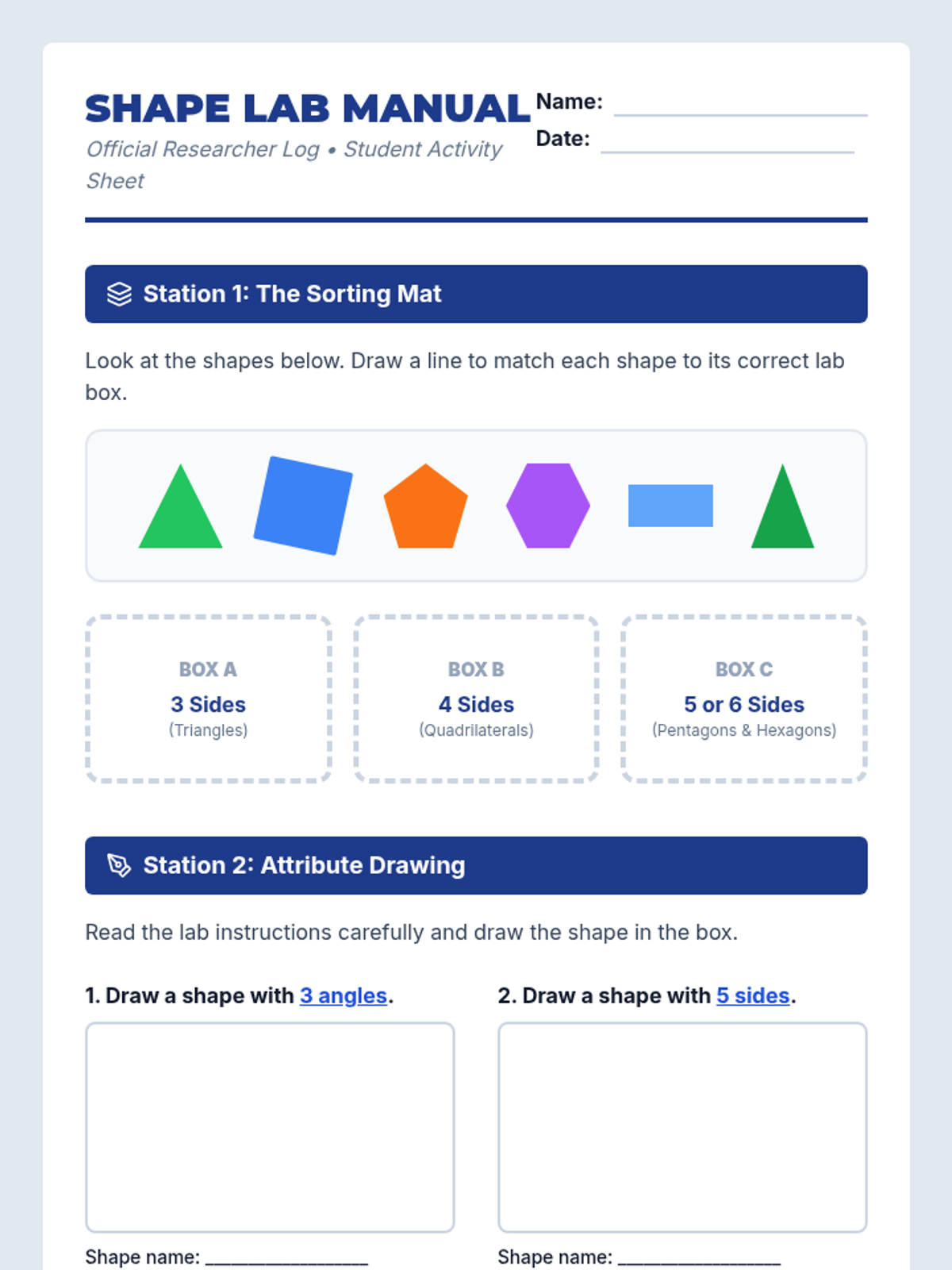 A student-facing worksheet for hands-on exploration of 2D and 3D shapes. Includes a recording table for sides and angles, a section for counting faces on a cube, and a sketching area.