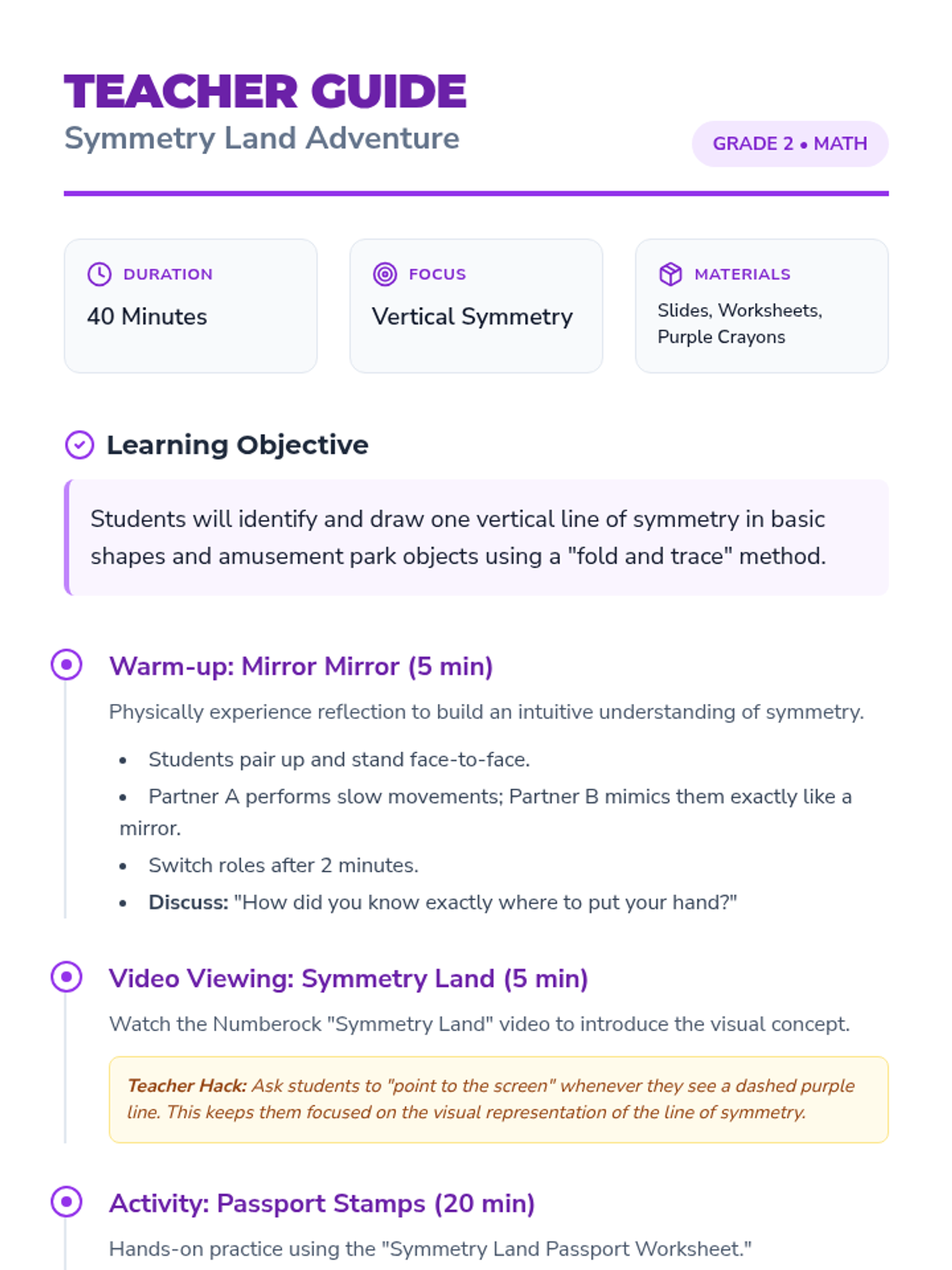 A detailed facilitation guide for teachers to deliver the Symmetry Land lesson, including timing, procedure, and key teaching moments.