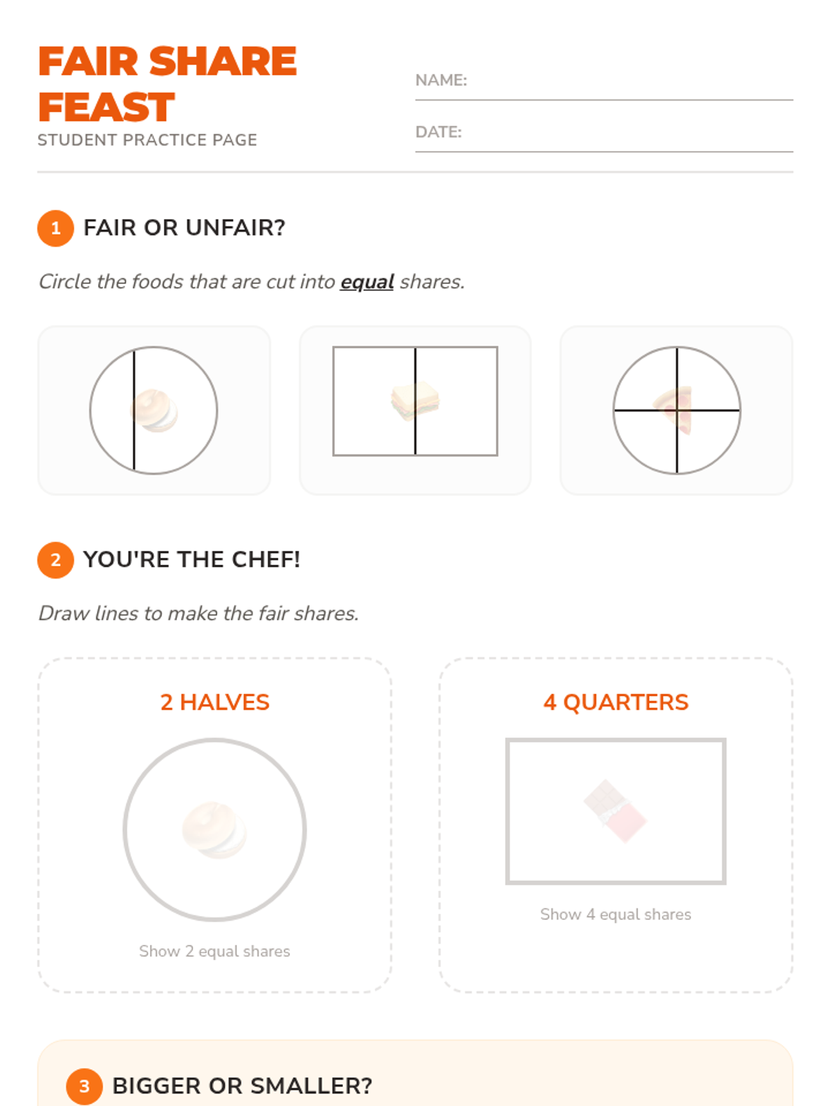 A student practice worksheet for partitioning circles and rectangles into halves and fourths. Includes visual identification of fair shares, guided partitioning tasks, and a sharing story problem assessment.