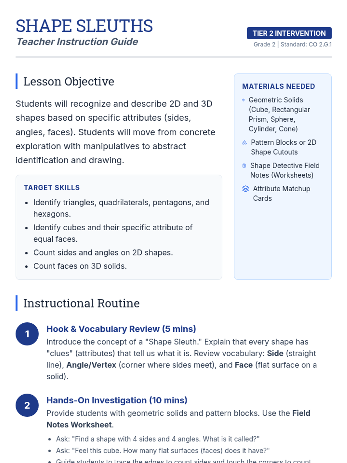 A comprehensive teacher guide for the Shape Sleuths intervention lesson, including objective, materials list, a 4-step instructional routine, and tips for addressing common misconceptions.