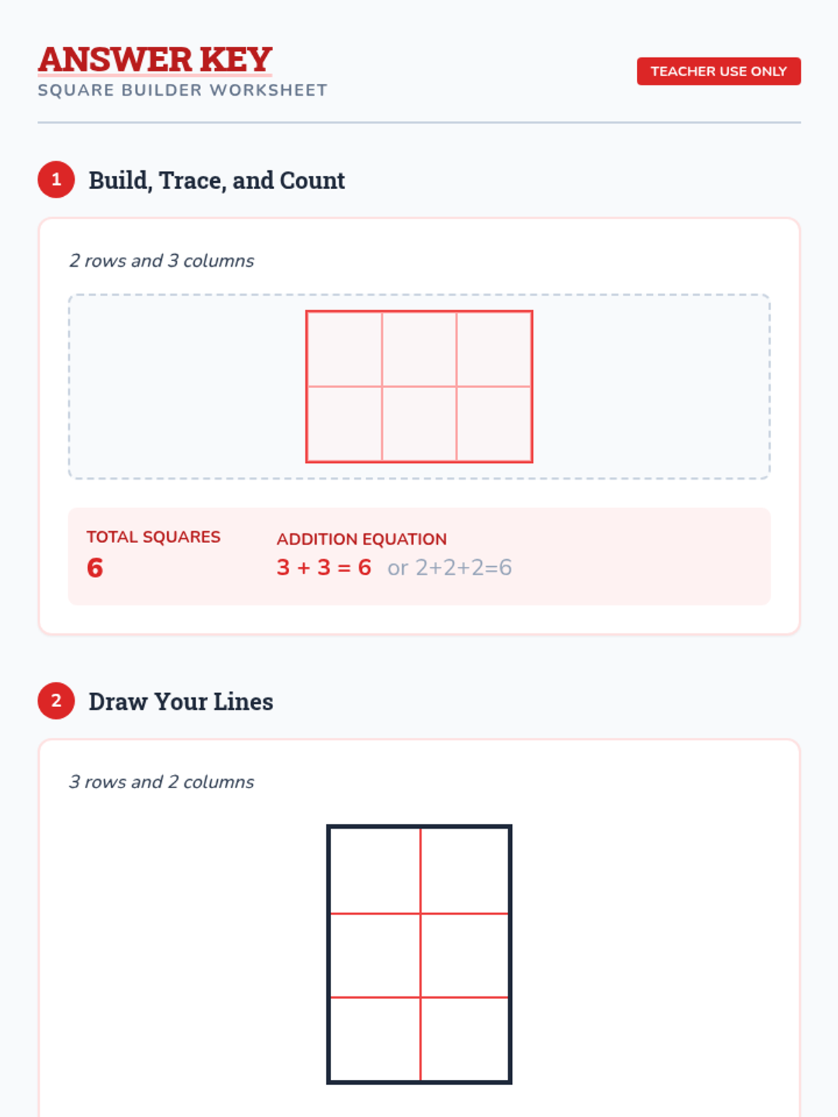 An answer key for the Square Builder Worksheet, providing clear visual and mathematical solutions for teacher use.