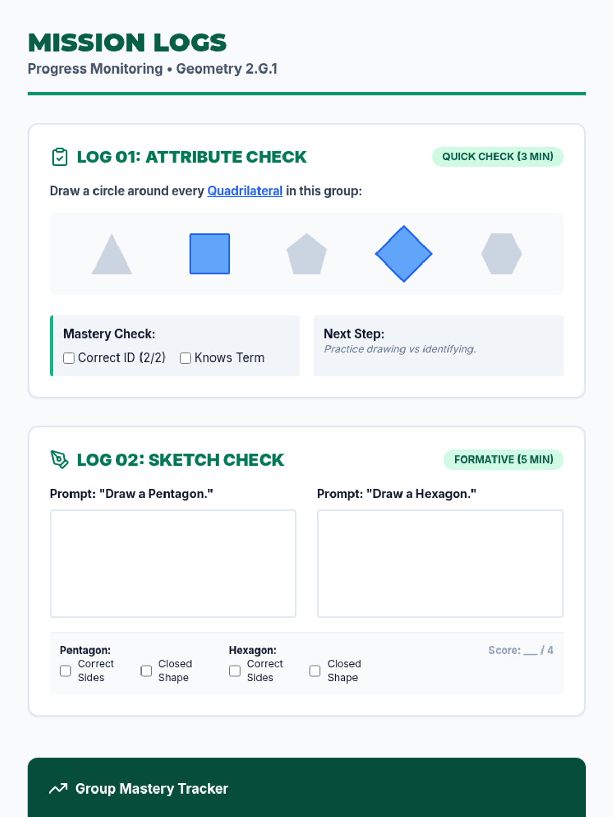A progress monitoring tool for teachers and students, featuring two 'Mission Logs' for quick checks on shape identification and drawing, along with a group mastery tracker for the teacher.
