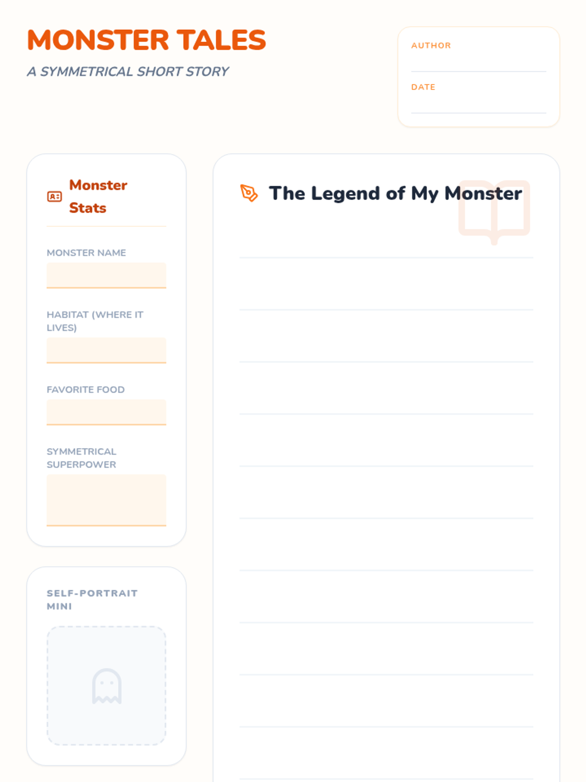 A creative writing extension sheet where students write a short story and develop a profile for their symmetrical monster creation.