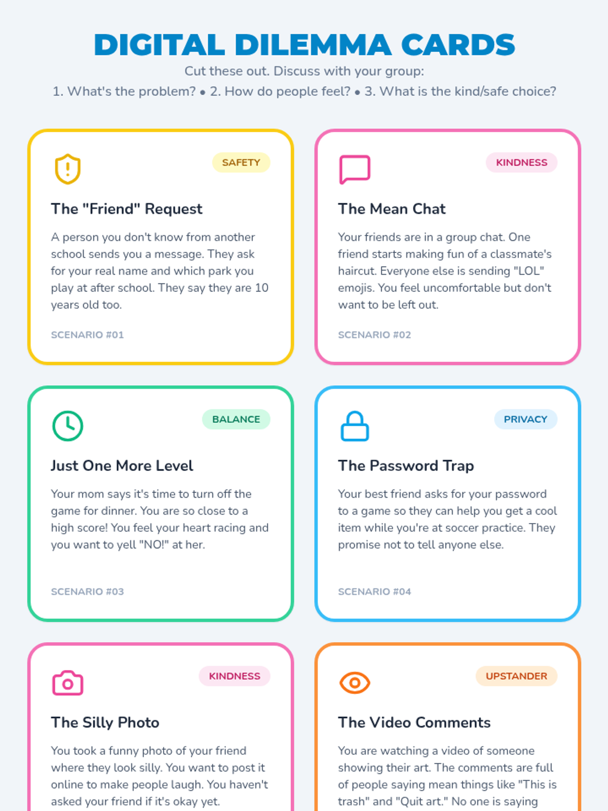 A set of six scenario-based discussion cards that prompt students to think critically about online safety, kindness, and screen time balance. Includes realistic situations relevant to grades 3-5.