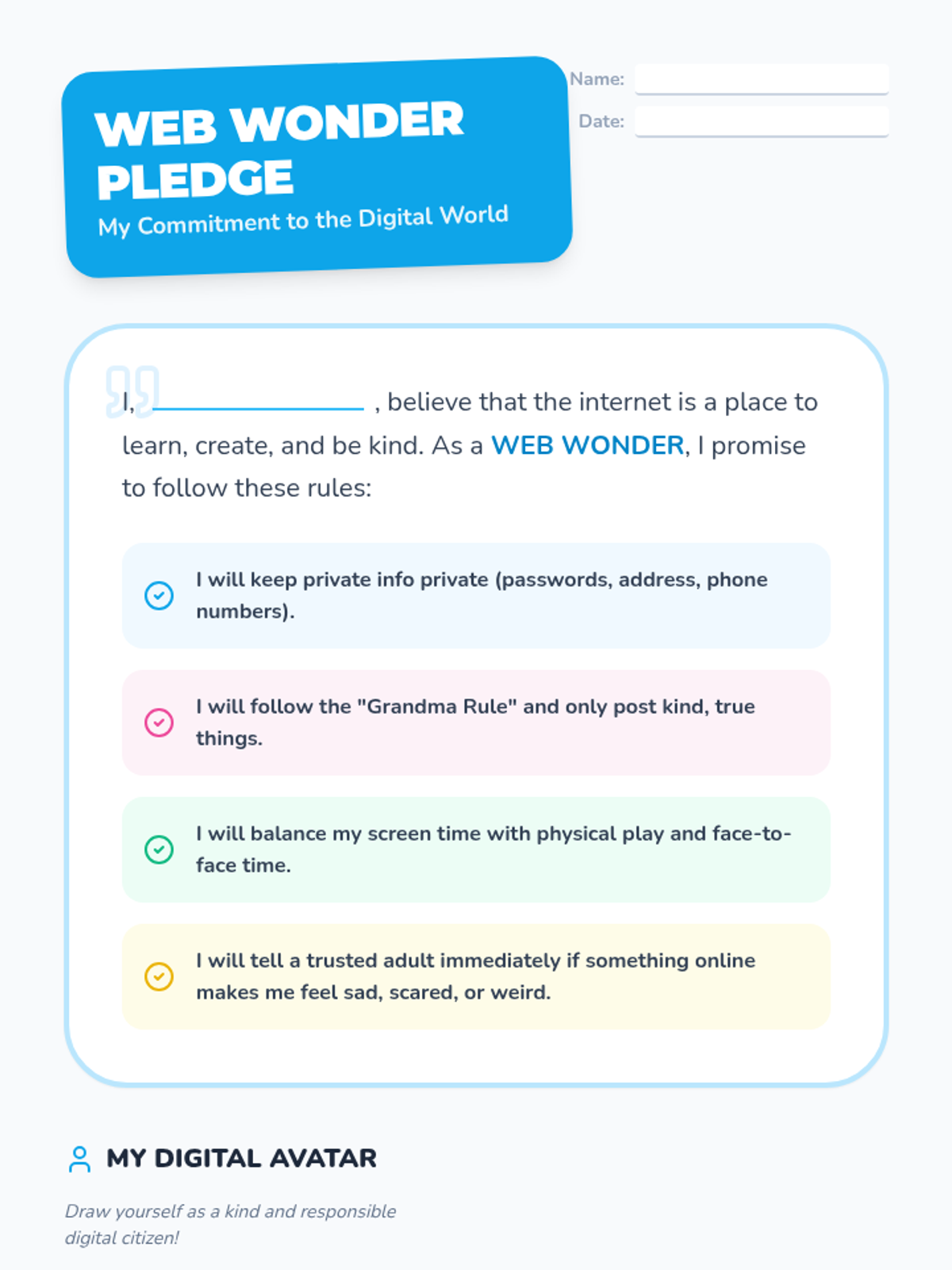 A creative student activity sheet where students commit to a digital citizenship pledge and design their own 'Digital Avatar' representing their responsible online identity.