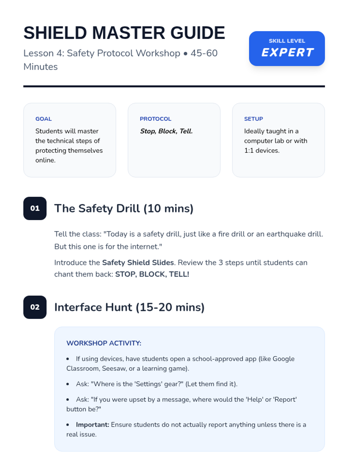 Teacher guide for Lesson 4: Safety Shield Protocol. Includes instructions for the technical 'Interface Hunt' and practicing the Stop, Block, Tell communication with adults.
