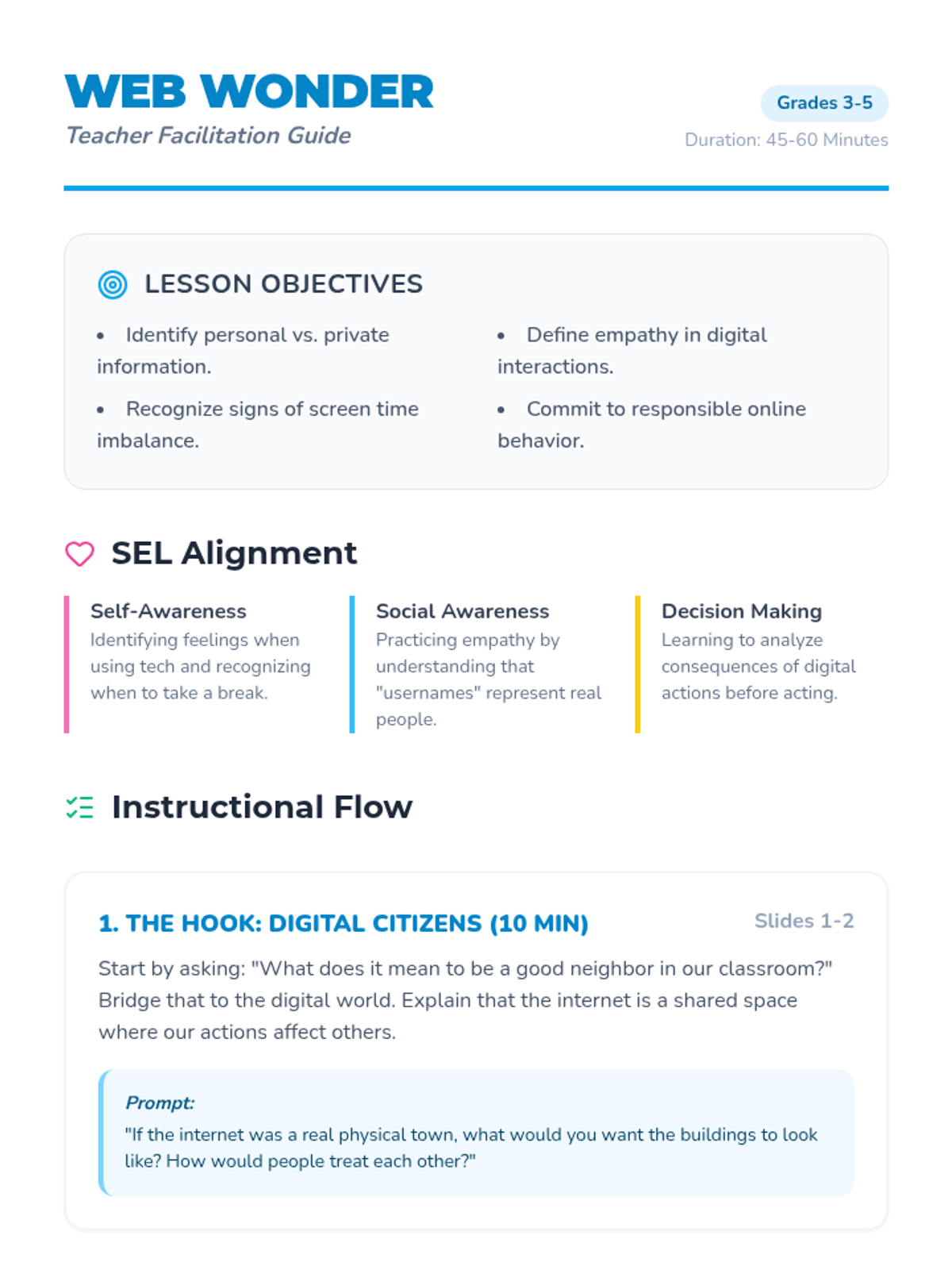 A detailed facilitator guide for teachers, providing a step-by-step instructional flow, SEL integration tips, and discussion prompts for the Web Wonder digital citizenship lesson.