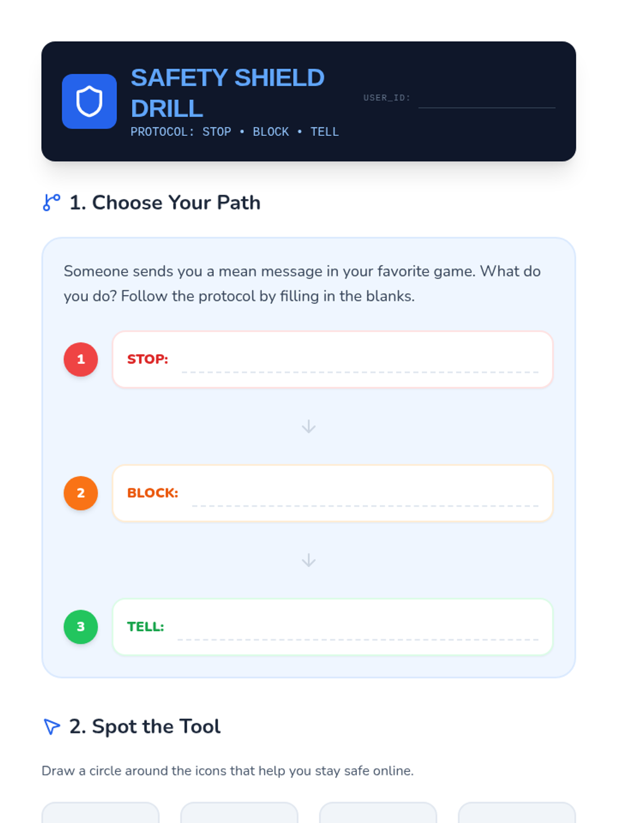 Student worksheet for Lesson 4: Safety Shield Protocol. Practical exercise for identifying reporting tools and planning the Stop, Block, Tell response.