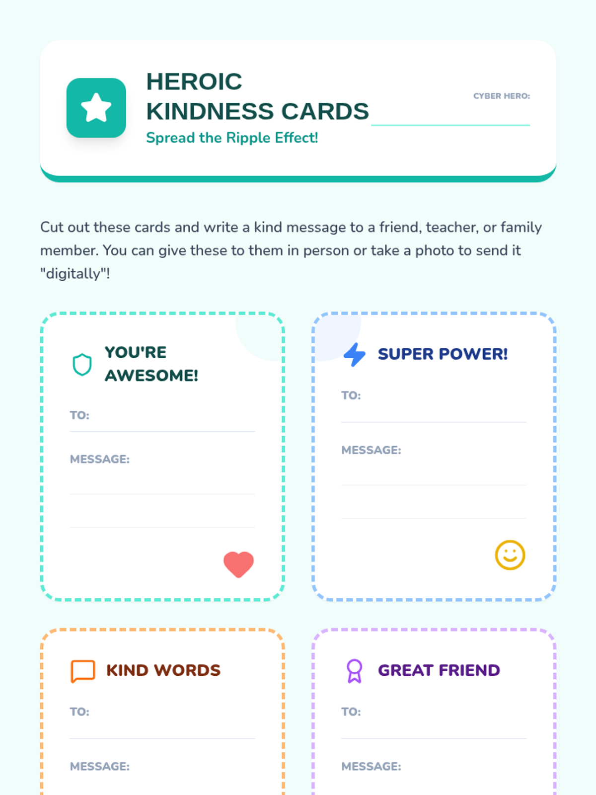Student activity sheet for Lesson 5: Promoting Online Kindness. Contains four themed 'Kindness Cards' for students to customize and share.