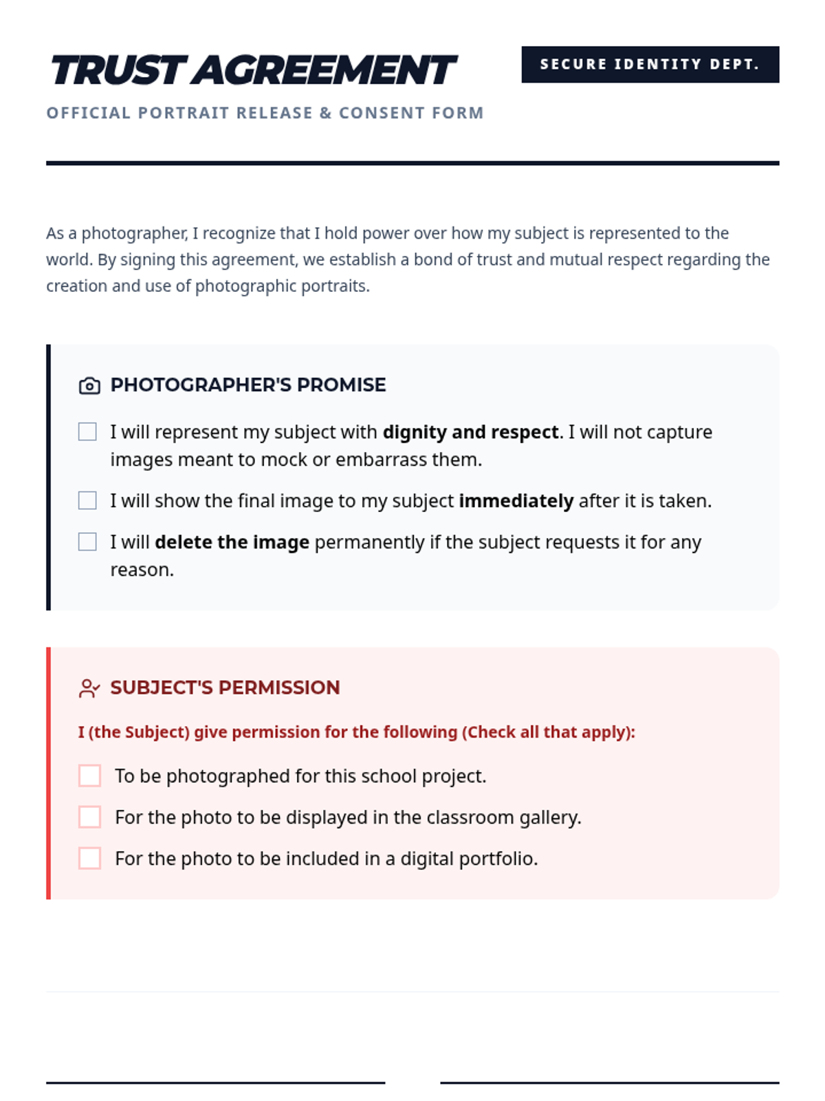 A professional-style student consent and release form for photography projects, focusing on respect, dignity, and the right to delete images.
