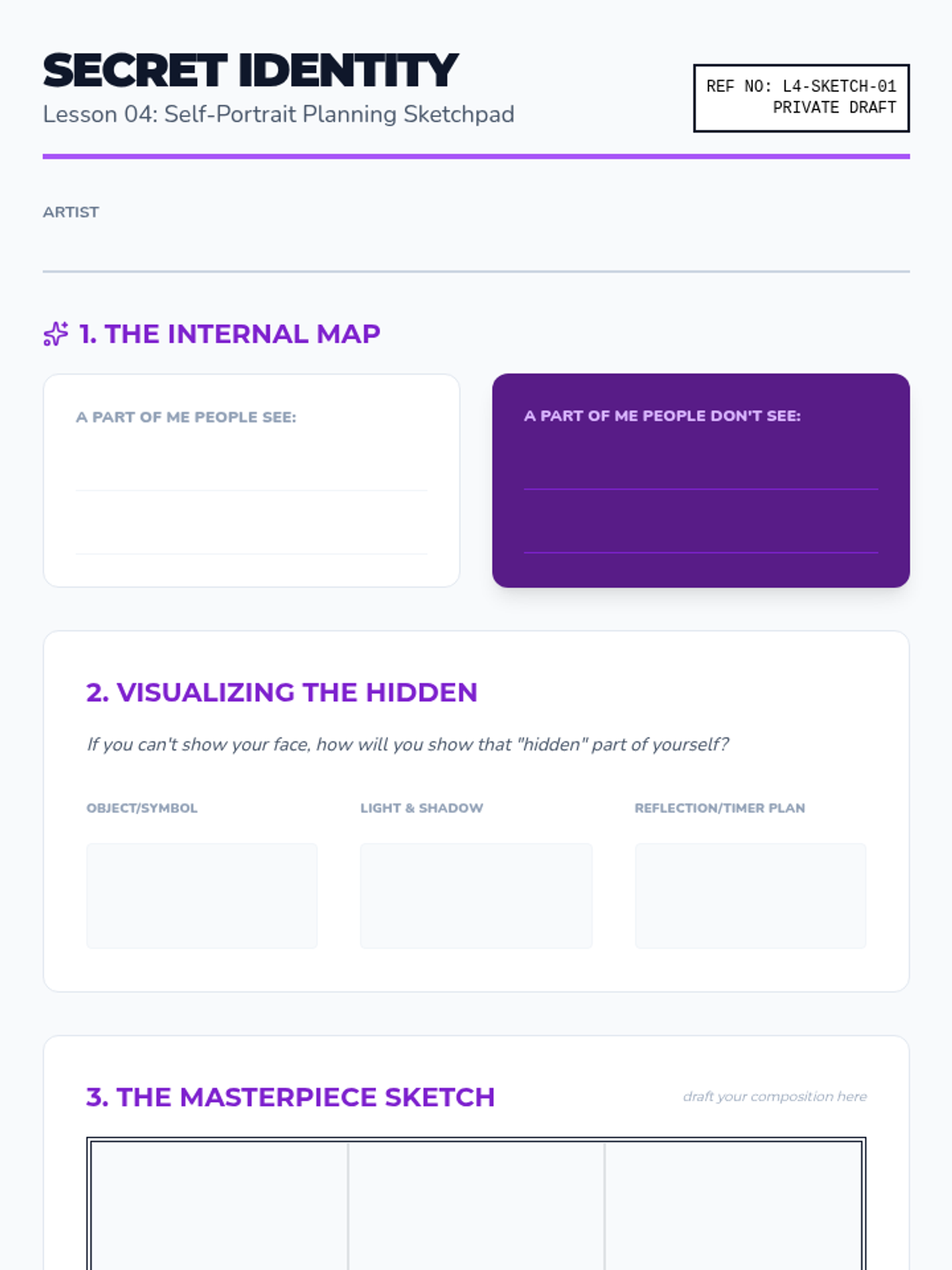 Brainstorming worksheet for Lesson 4 where students plan a self-portrait that explores their identity without showing their face.