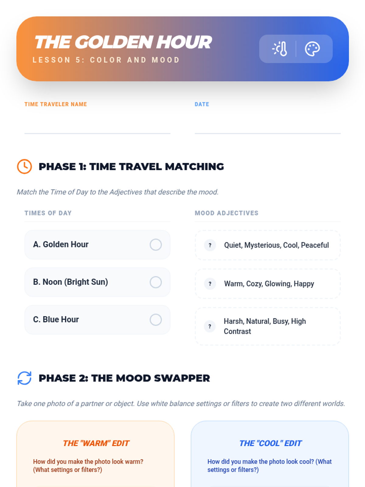 A student worksheet for the 'Golden Hour Glory' lesson, helping students compare warm and cool color temperatures and their emotional effects.
