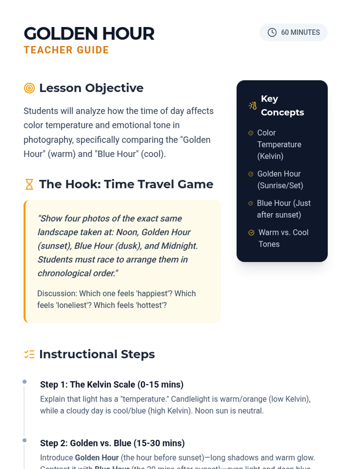 A comprehensive teacher guide for Lesson 5: Golden Hour Glory, focusing on color temperature, time of day, and emotional tone in photography.