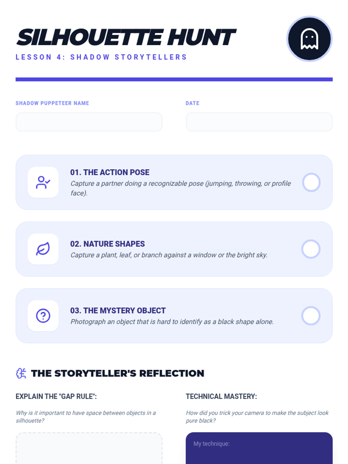 A student scavenger hunt worksheet for the 'Silhouette Storytellers' lesson, encouraging students to find and capture three distinct types of silhouettes.