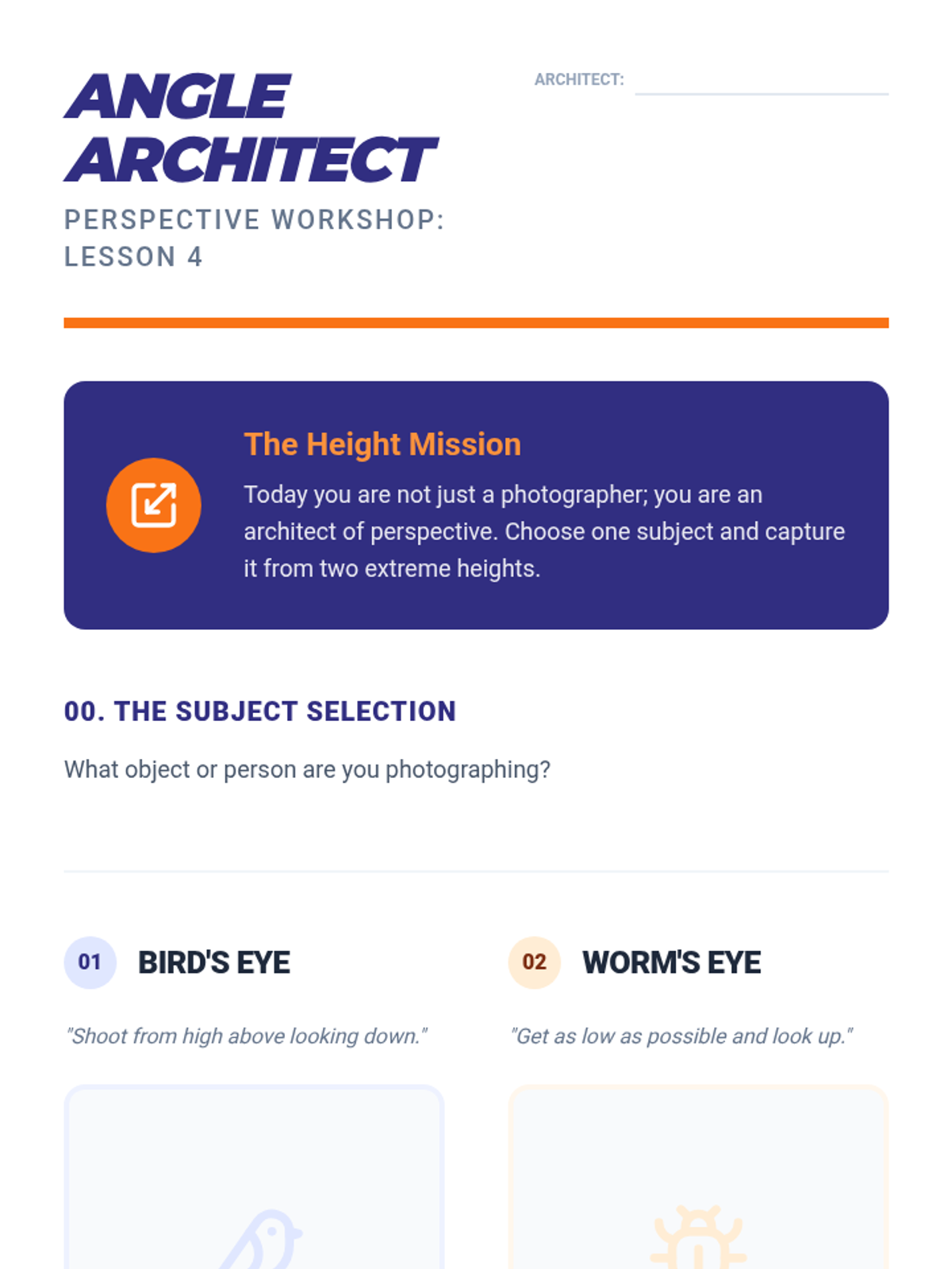 A student worksheet for recording observations and sketches from different camera angles (Bird's Eye vs. Worm's Eye). Uses a bold indigo and orange theme.