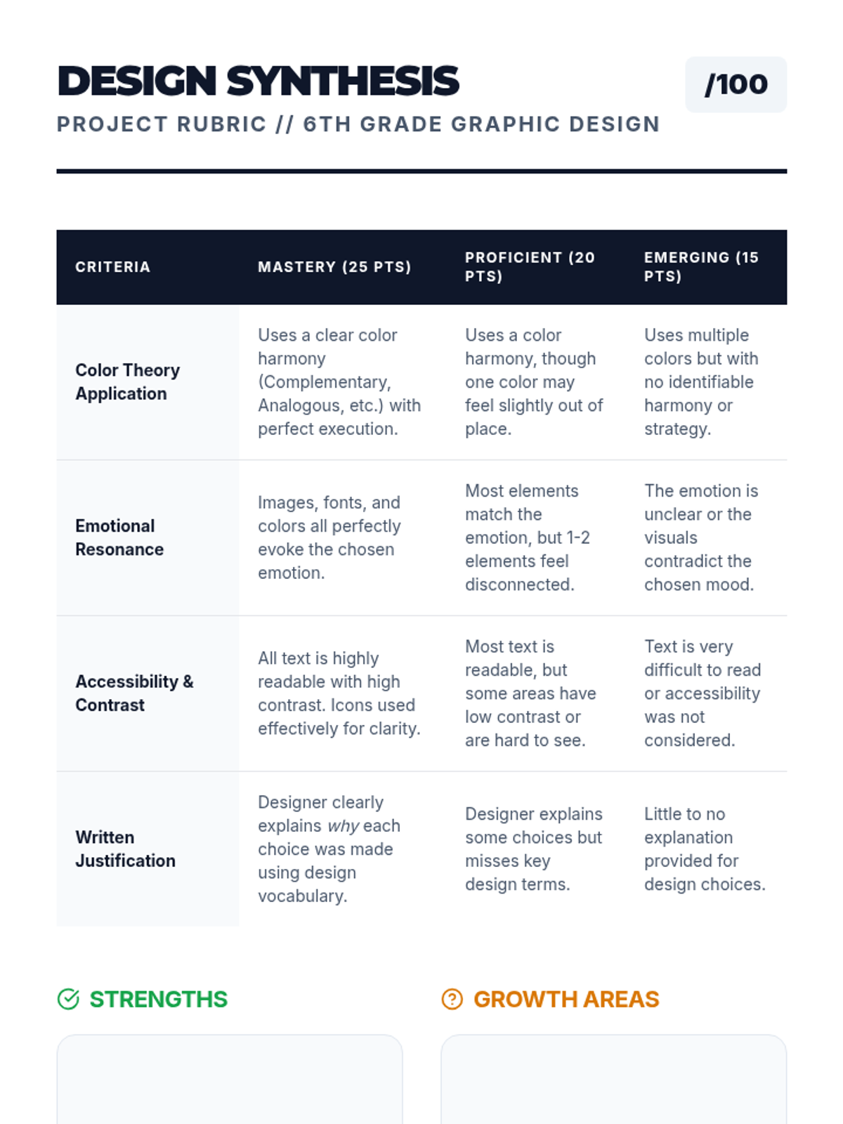 A comprehensive project rubric focusing on typography mood, visual hierarchy, legibility, and craftsmanship.