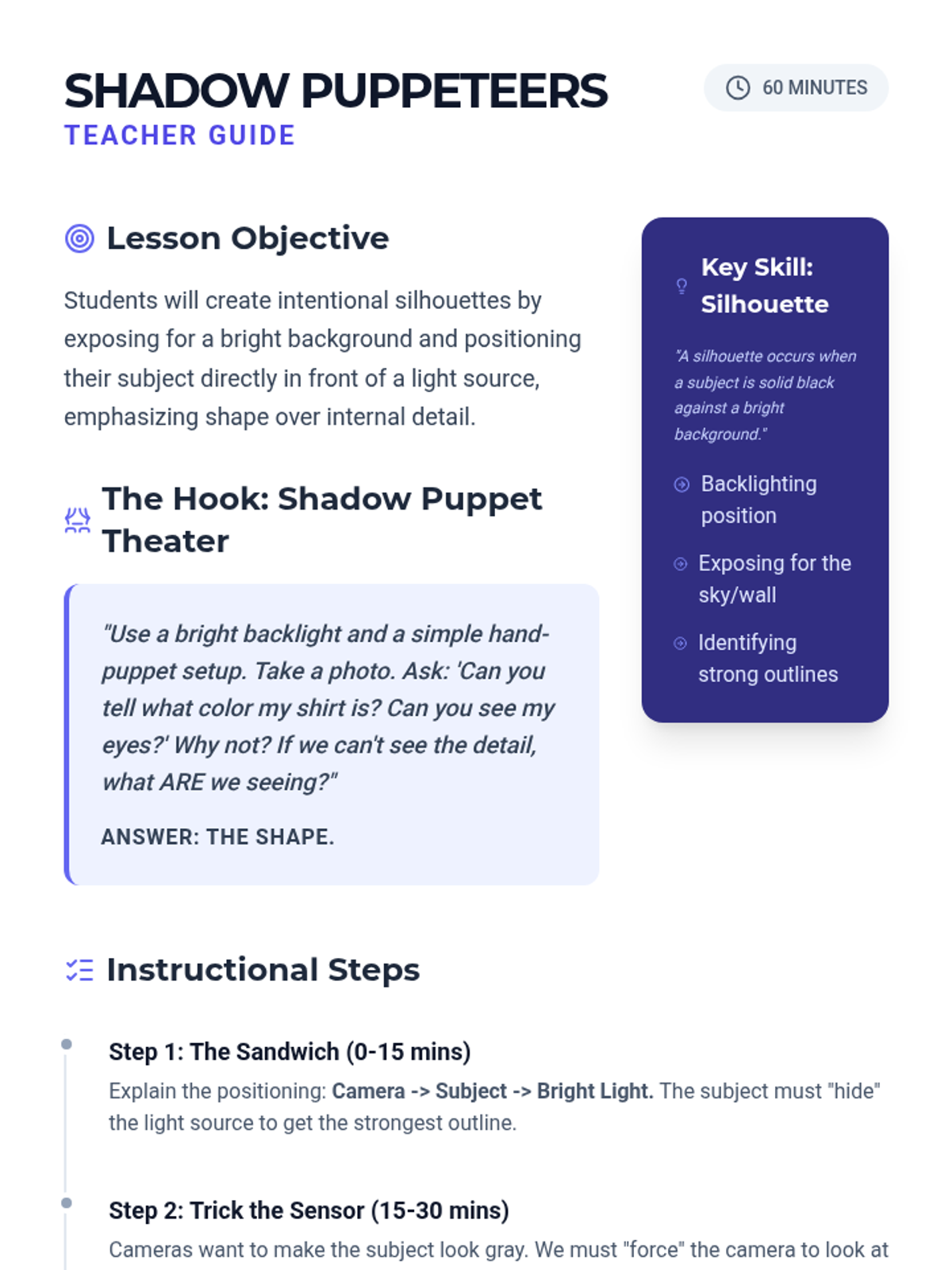 A teacher resource for Lesson 4: Silhouette Storytellers, focusing on backlighting and shape recognition.