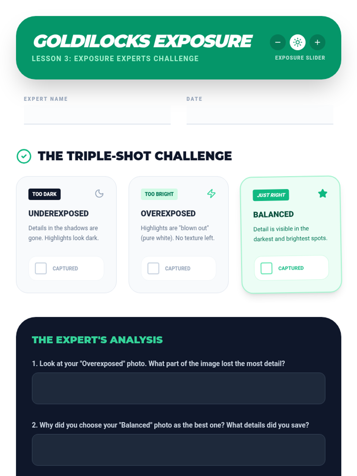 A student worksheet for the 'Exposure Experts Challenge' lab, guiding learners through taking and reflecting on three different exposure levels.