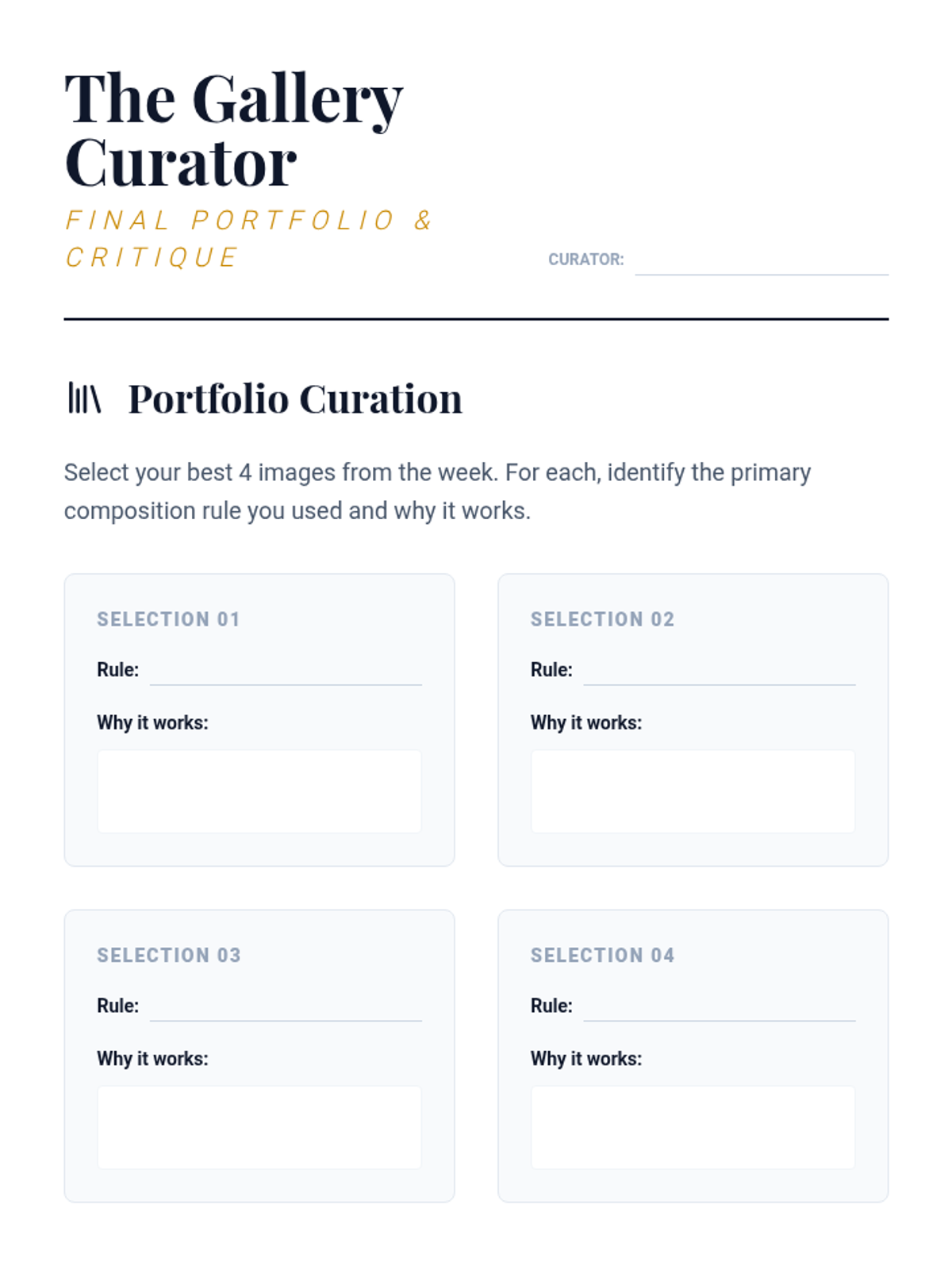 A student curation and peer-review worksheet for the final lesson. Guides students through selecting their portfolio and providing structured TAG feedback. Uses a sophisticated gallery theme.
