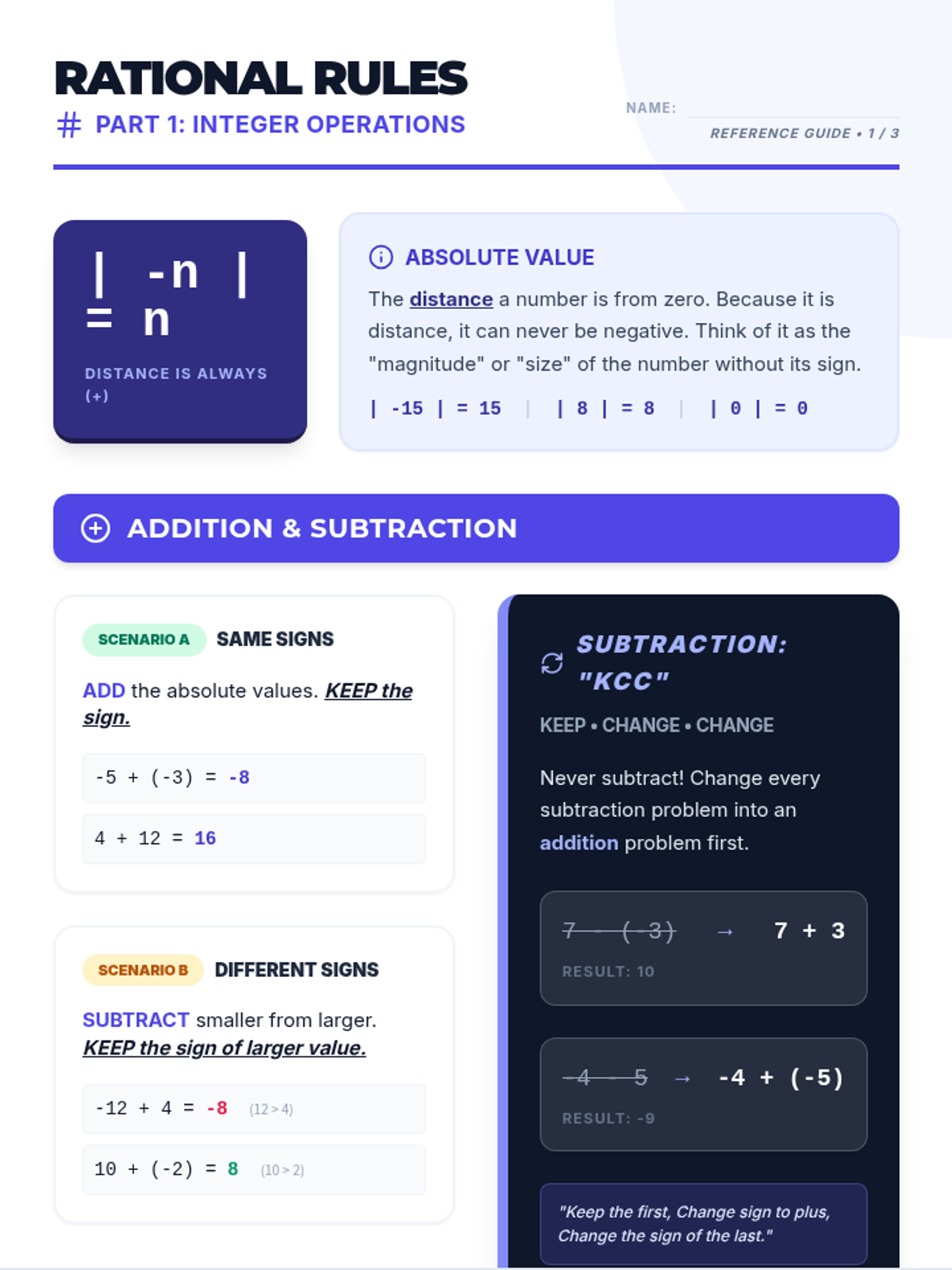 A redesigned three-page reference sheet for rational number operations. Page one focuses on integer rules with absolute value, addition, subtraction (KCC), and multiplication/division sign tricks. Page two covers decimals with detailed guides on lining up dots, counting places for multiplication, and the 'Top in the Box' method for division. Page three masters fractions with common denominators, the KCF method, mixed-to-improper conversion (MAD), and a table of common conversions, ending with a logical 'Reality Check' section.