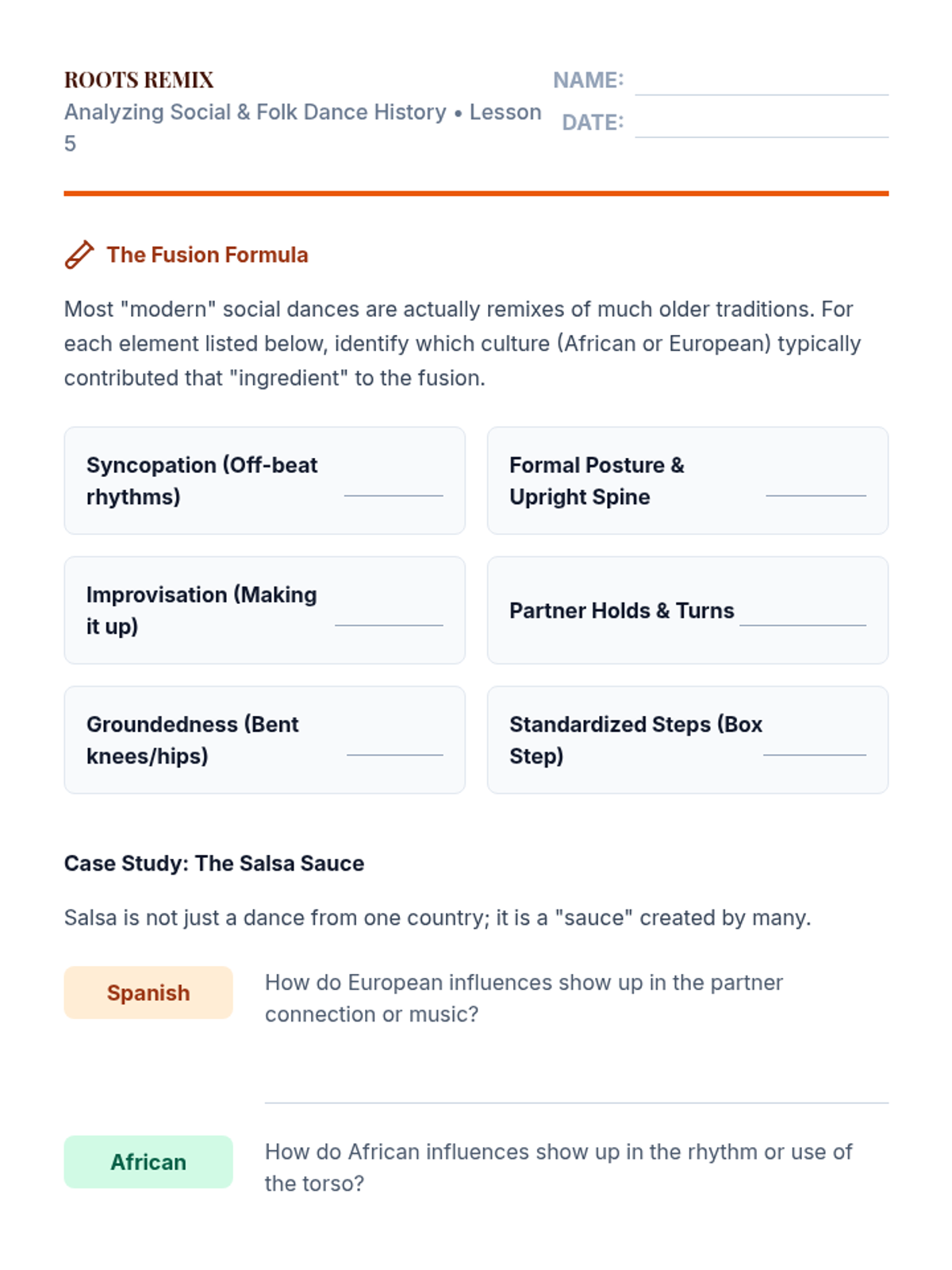 Student worksheet for Lesson 5, identifying the cultural contributions to fusion dances like Salsa and Tap and reflecting on the broader sequence.