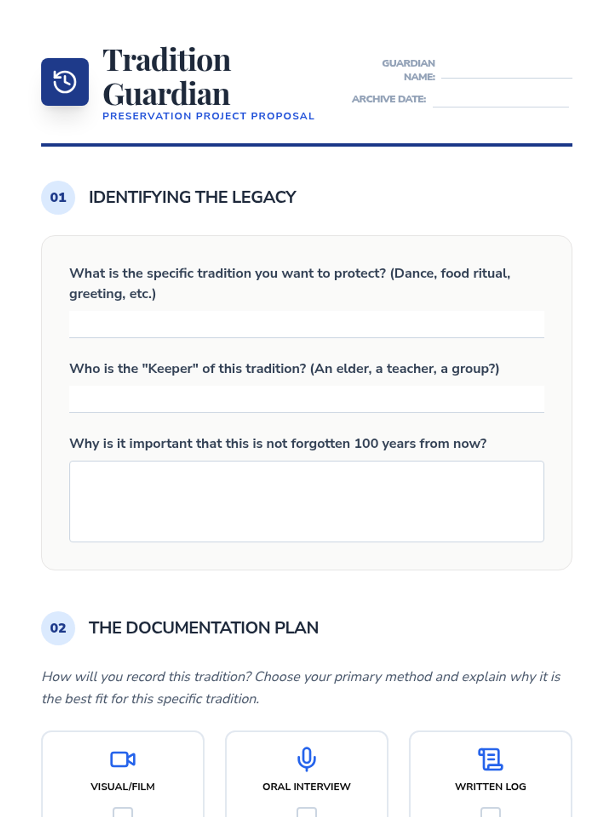 A student project guide for Lesson 5, where students propose a method to document a local or family tradition as a final assessment.