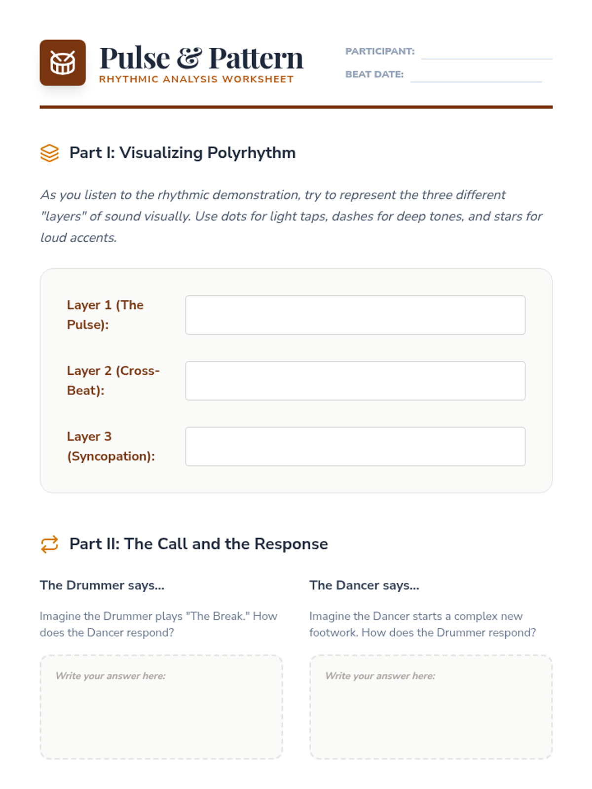A student worksheet for Lesson 3 focusing on visualizing polyrhythms and analyzing the communicative dialogue between drummers and dancers.