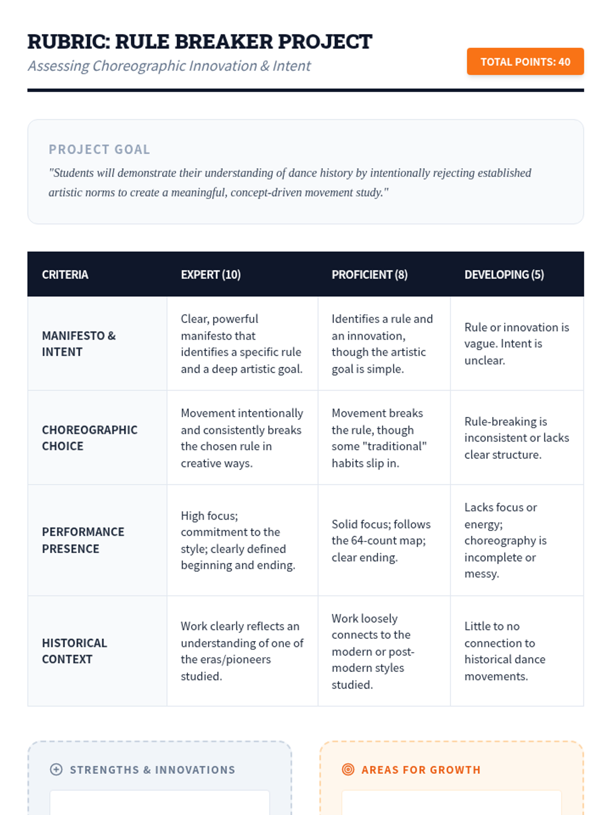 A formal rubric for the final Rule Breaker Project, assessing students on their manifesto, choreographic choices, performance presence, and historical connection.