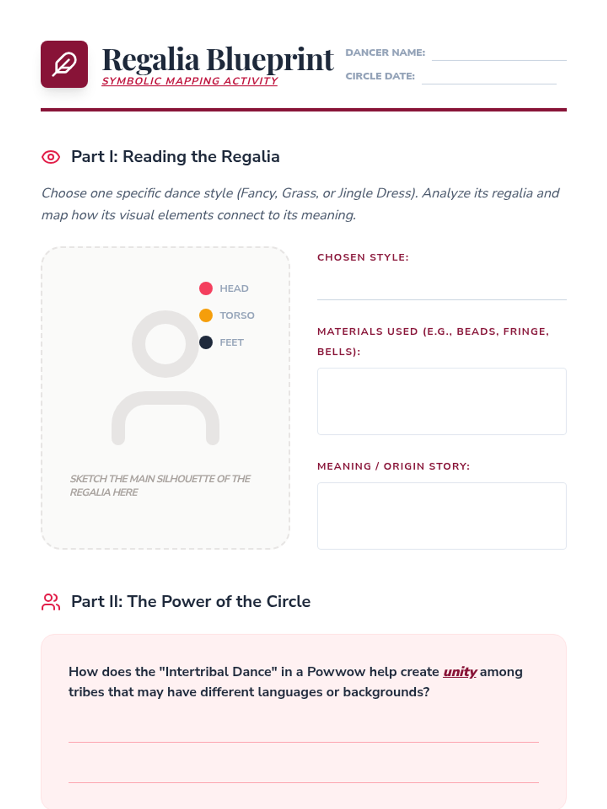 A student worksheet for Lesson 4 where students analyze the visual and symbolic elements of specific Indigenous Powwow regalia styles.