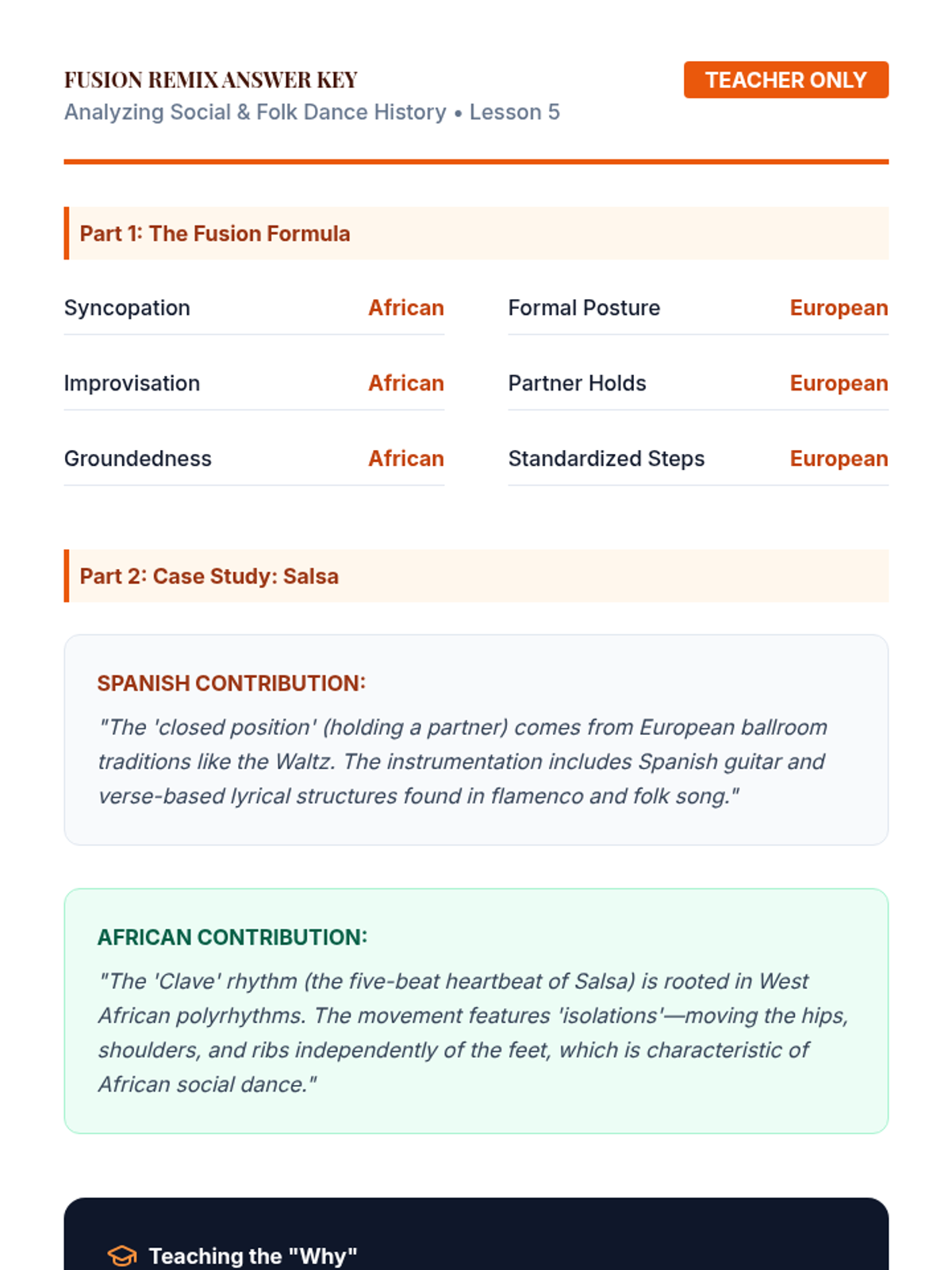 Teacher answer key for Lesson 5, detailing the cultural origins of fusion dance elements and providing pedagogical context for the final reflection.