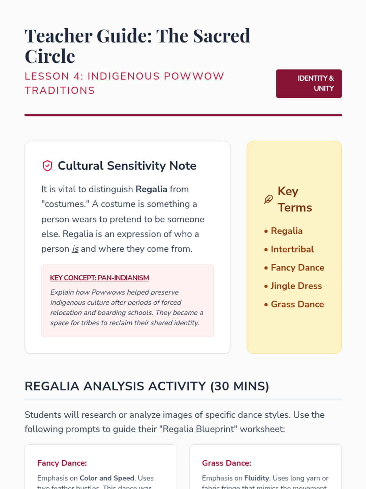 Slides for Lesson 4 exploring the significance of regalia and intertribal unity in North American Indigenous Powwow traditions.